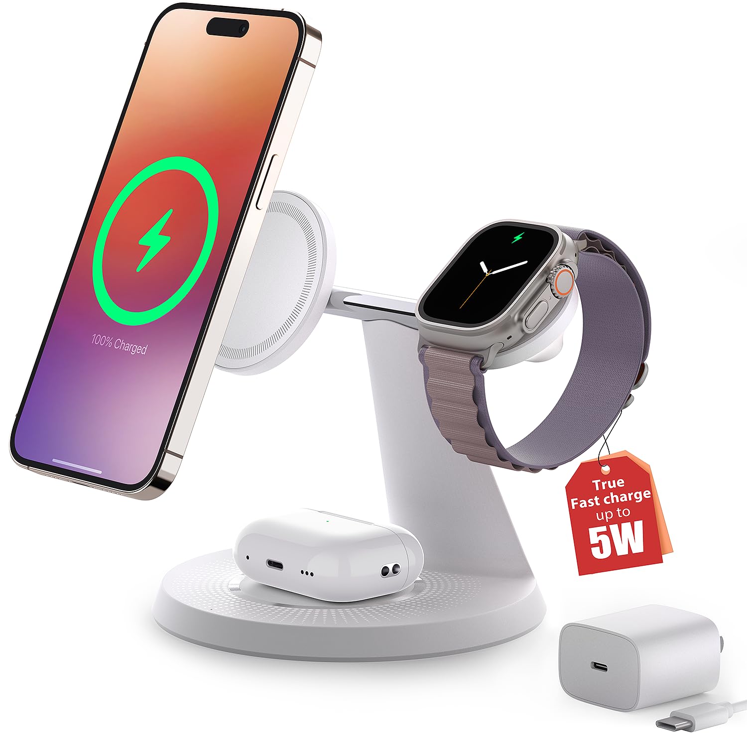 - What's Included: 3-in-1 Magnetic wireless Charger, 5.3 ft (1.65m) USB-C cable, Power Adapter, user manual, 2-year warranty, and 24-hour friendly customer service