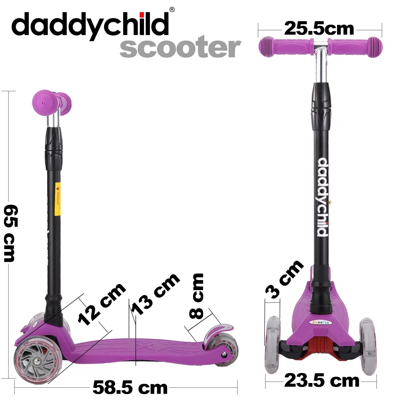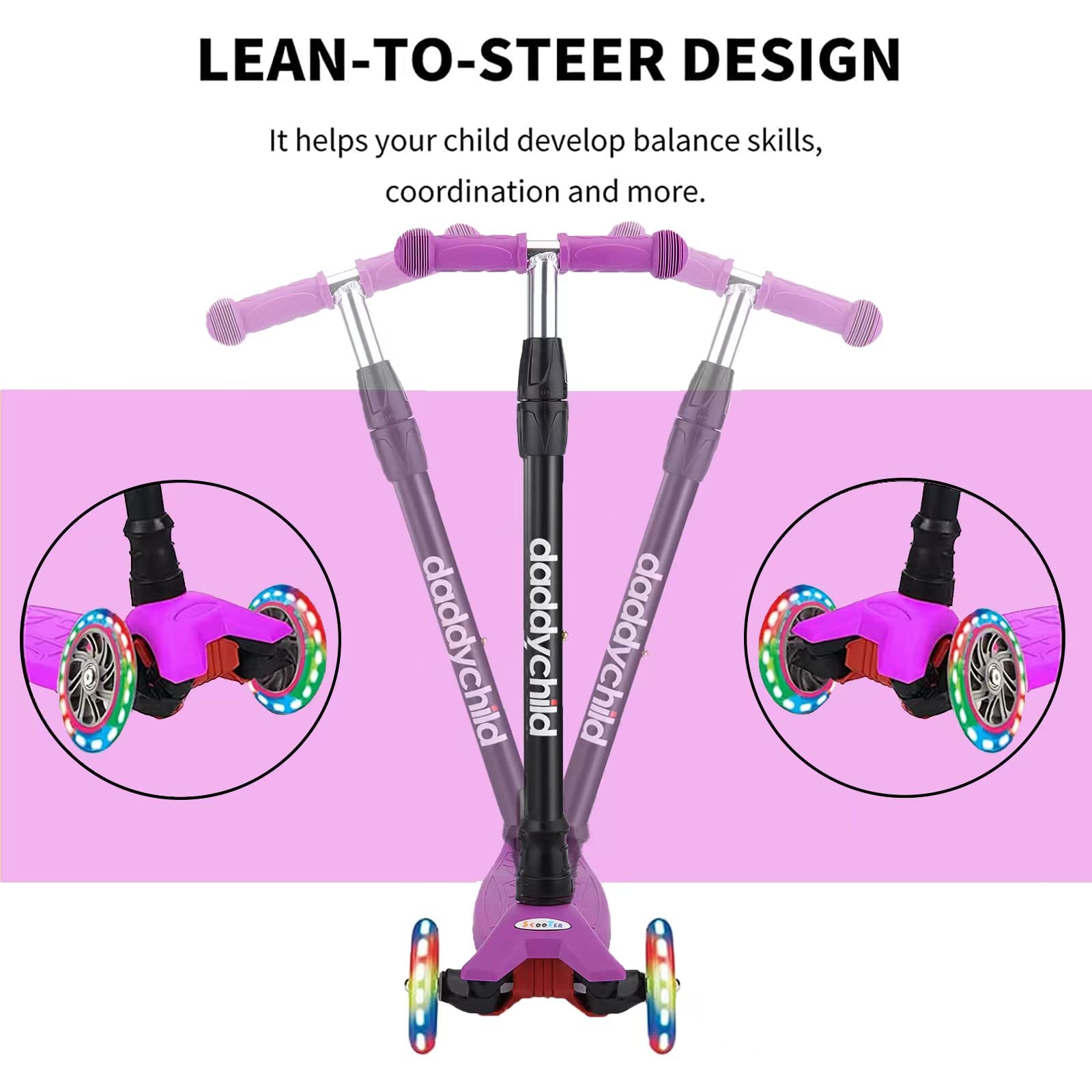 - MULTI-COLOR WHEEL LIGHTS: The DADDYCHILD 3-Wheel Kick Scooters for Kids feature colorful LED turning wheel lights that light up in a variety of flashing colors as you scoot, adding a fun twist to the ride! It also makes the scooter stand out