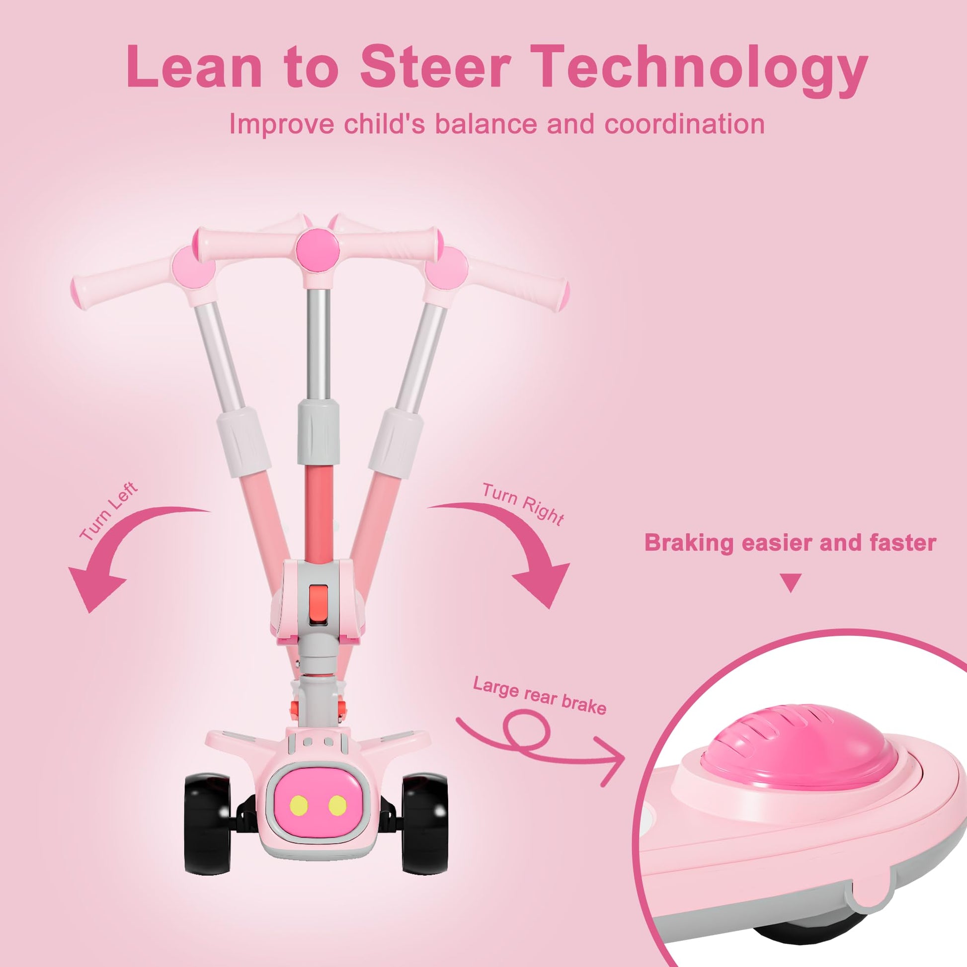 - Safe & Smooth Ride: Our scooter has lean-to-steer tech for kids to control turns by leaning, improving balance and coordination. Sturdy and widened PU wheels ensure stability and smooth riding for safe and fun.