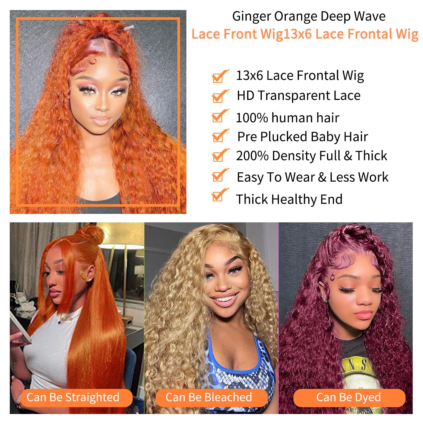 - Ginger Orange lace front wigs Pre Plucked:deep red orange wig human hair Ginger wig human hair Human Hair Pre Plucked Natural Hairline,13x6 Ginger lace front wigs human hair HD Transparent Lace,Large lace Can Make Middle Part or Side Part, Make You Hair Style More Natural and Gorgeous,orange deep wave wig human hair is more beautiful and you'll get more compliments.