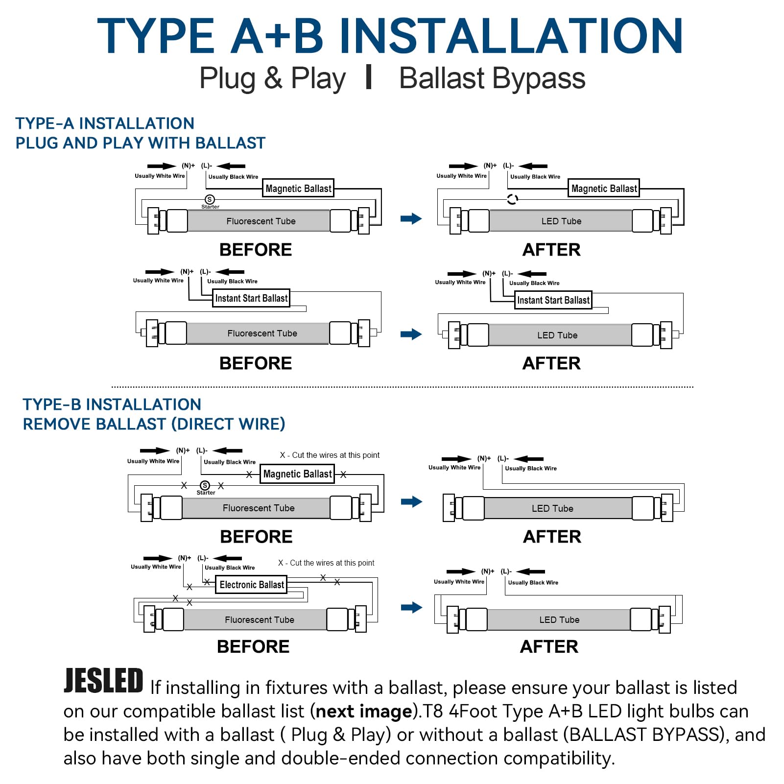 - Plug and Play or Ballast Bypass - JESLED T8 4 Foot Type A+B LED light bulbs can be installed with a ballast( Plug & Play) or without a ballast (BALLAST BYPASS), making LED conversion fast, simple and secure