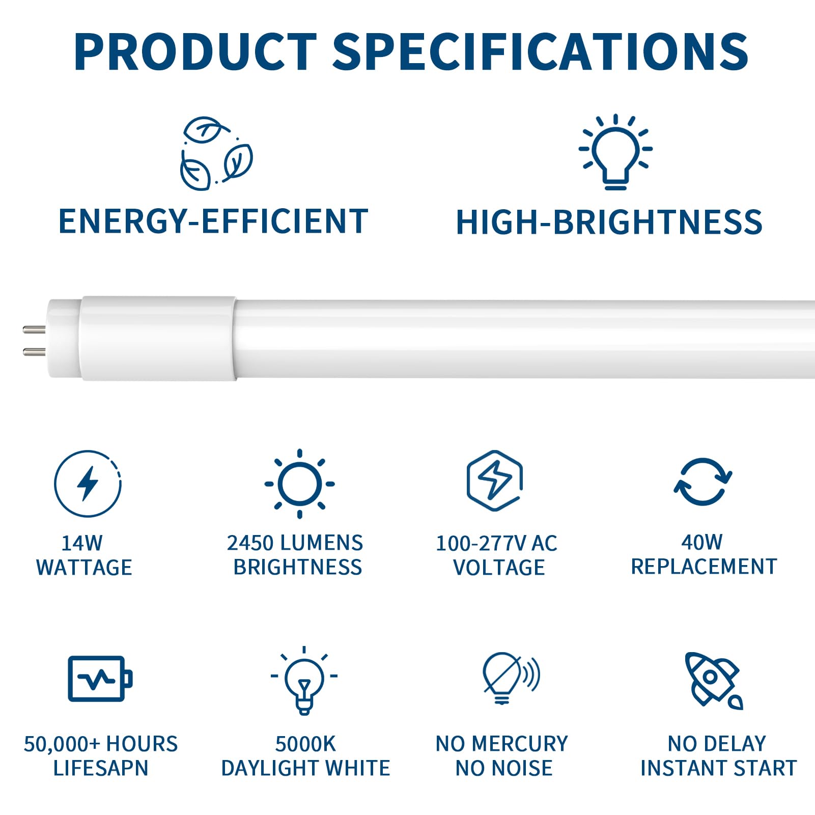 - Energy Saving - These 40 watt equivalent LED tube lights only use 14 watts and produce 2450 lumens; instant on brightness; Emits no ultraviolet light which makes it safe to use in your garage, shop or warehouse ; 100% mercury free;
