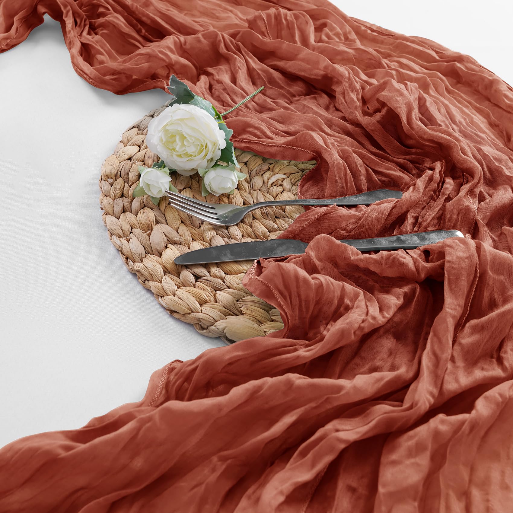 - 【MATERIAL】Made from high quality premium gauze table runner with wrinkled gauze fabric,soft,flowy,rustic-elegant and delicate.The edges of the gauze rustic table runner are carefully stitched to stay in perfect condition.With this hemmed style cheese cloth table runner,adding a touch of romantic and elegant to your events.
