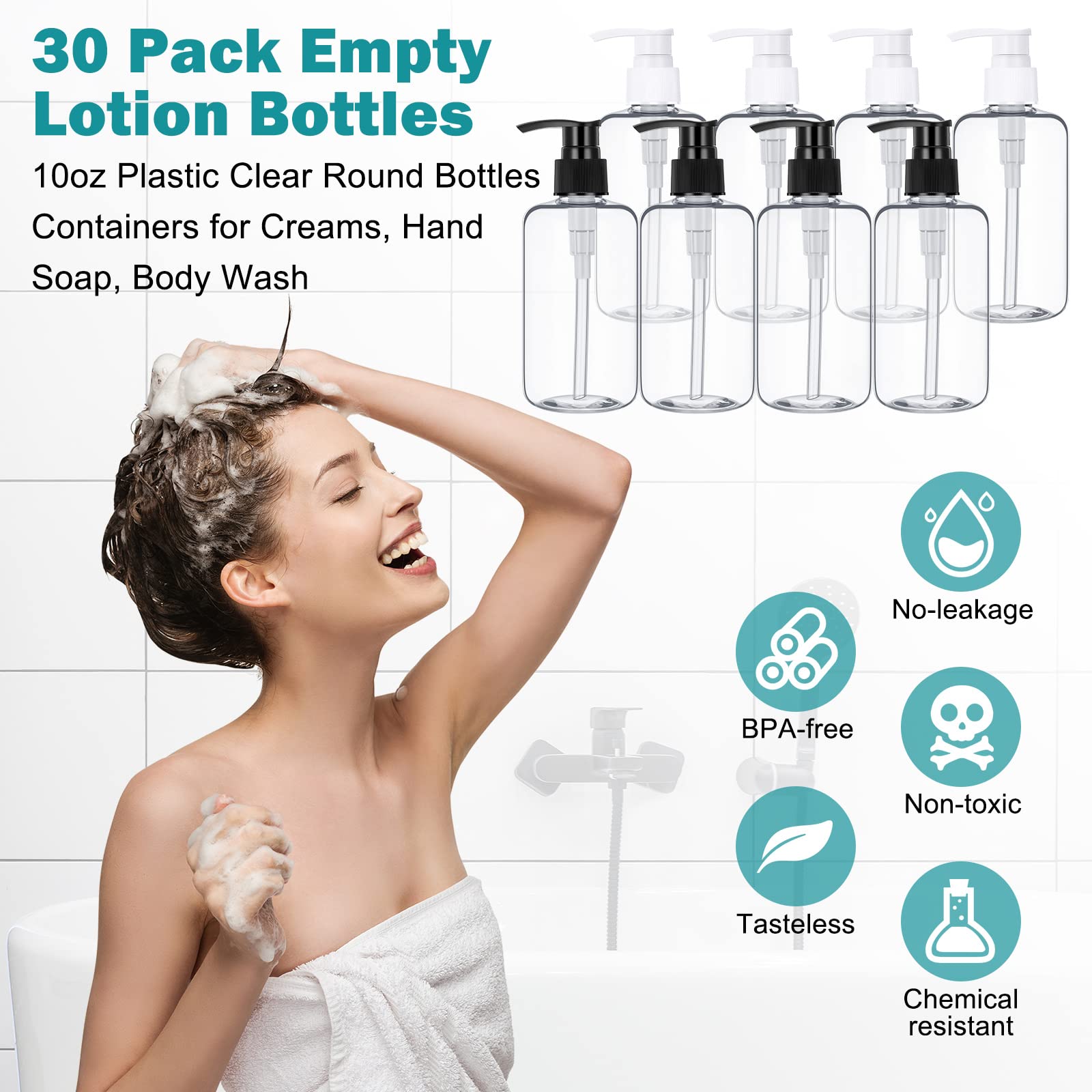 - Large Quantity: there are 30 pieces of plastic empty shampoo bottles with white and black pumps, 15 pieces for each color, enough to meet your needs of daily use and travel replacement, and you can also share them with others