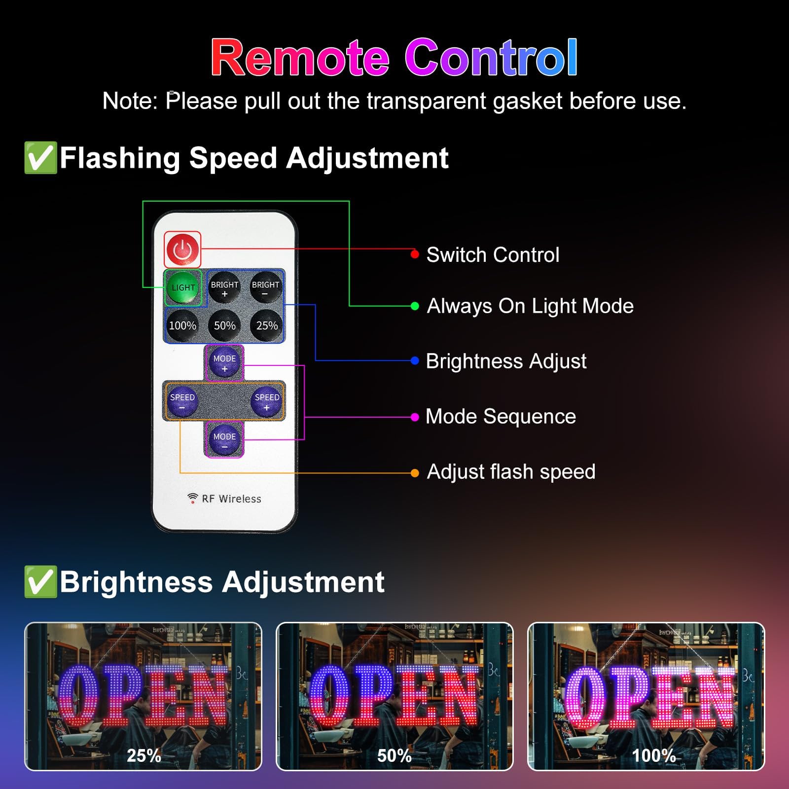 - 【Remote Control】: Our open closed sign is equipped with a remote control, allowing you to easily turn on and off,adjust the light brightness speed and has 14 flashing modes to add brilliance to your store.