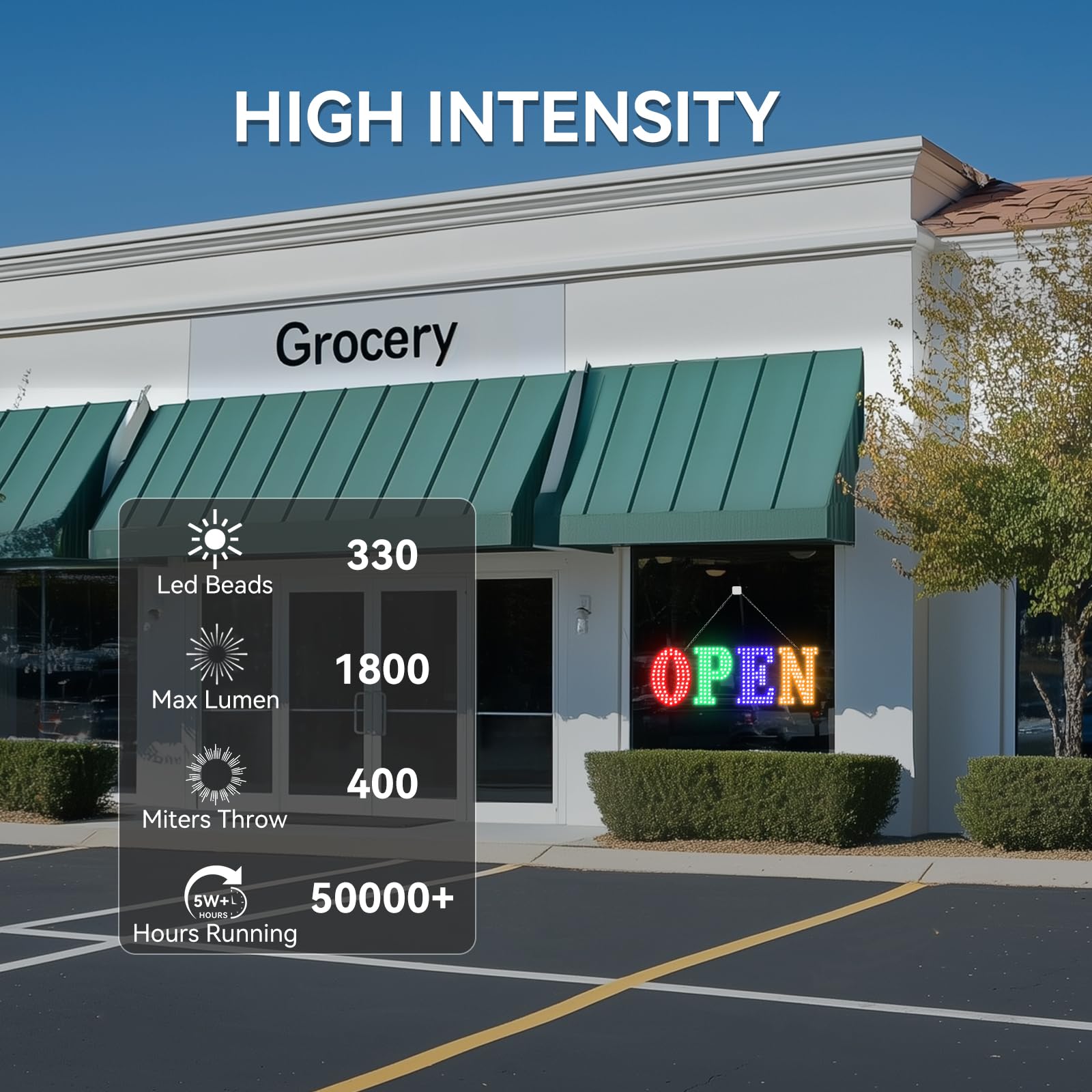 - High-Visibility LED Open Sign: Boost foot traffic with 330 ultra-bright LEDs producing 1500 lumens, visible from 400 meters. This 30"x10" open sign ensures 24/7 visibility. Ideal for attracting both daytime shoppers and night-time patrons with its eye-catching illumination