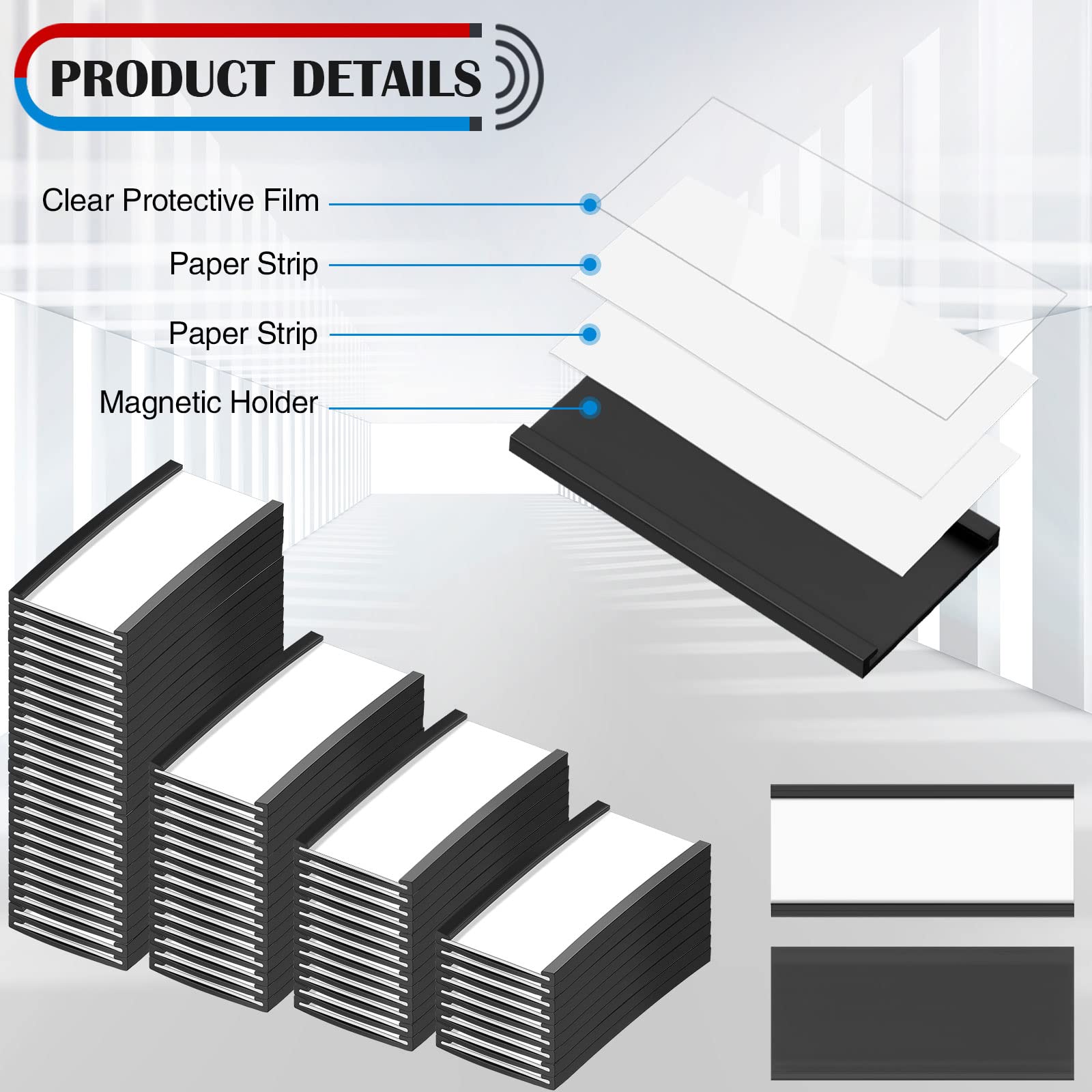 - Quick Labeling: our magnetic label holders for shelves have enough replacement white paper strips, you can write text on the paper strips, then insert the paper strips into paper clips and clear protective film, and then attach the magnetic label holder to a clean and flat metal surface, which allows for quicker repositioning; Compared to traditional self adhesive labels, our magnetic label holder is easy to move and replace, saving you time