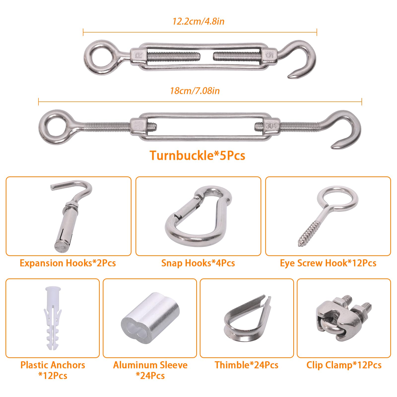 - 【Package List】199PCS in total. 300FT 1/8" vinyl coated wire stainless steel cable, 5PCS M5 turnbuckle, 12PCS M3 wire rope cable clip clamp, 2PCS M6 expansion hooks, 4PCS M5 snap hooks, 24PCS M3 thimbles, 24PCS M3 aluminum sleeve, 12PCS M5 sheep eye screw hook, 12PCS M5 plastic anchors, 1PC socket wrenches, 1PC tape measure, 100PCS black twist tie and 1PC user manual.