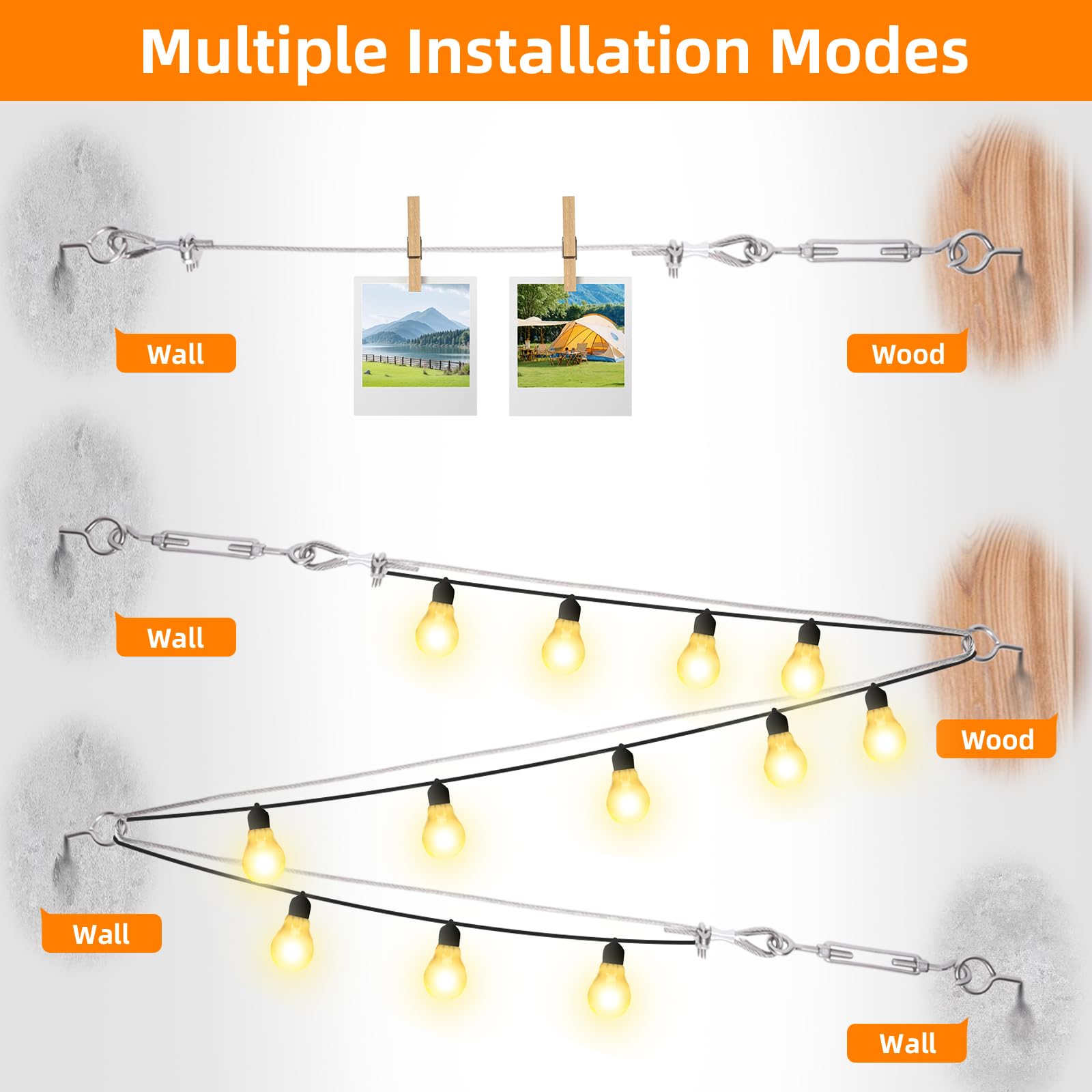 - 【Wide Application】Wire rope kit is widely used for wire rope applications and anything else that requires strong cable, like hanging string lights for a romantic party, patio, backyard, garden, or porch. It's great for trellis wire kits, plant climbing kits, outdoor cable railings, wire railing kits, picture hanging, clothesline cables, and more hanging needs.