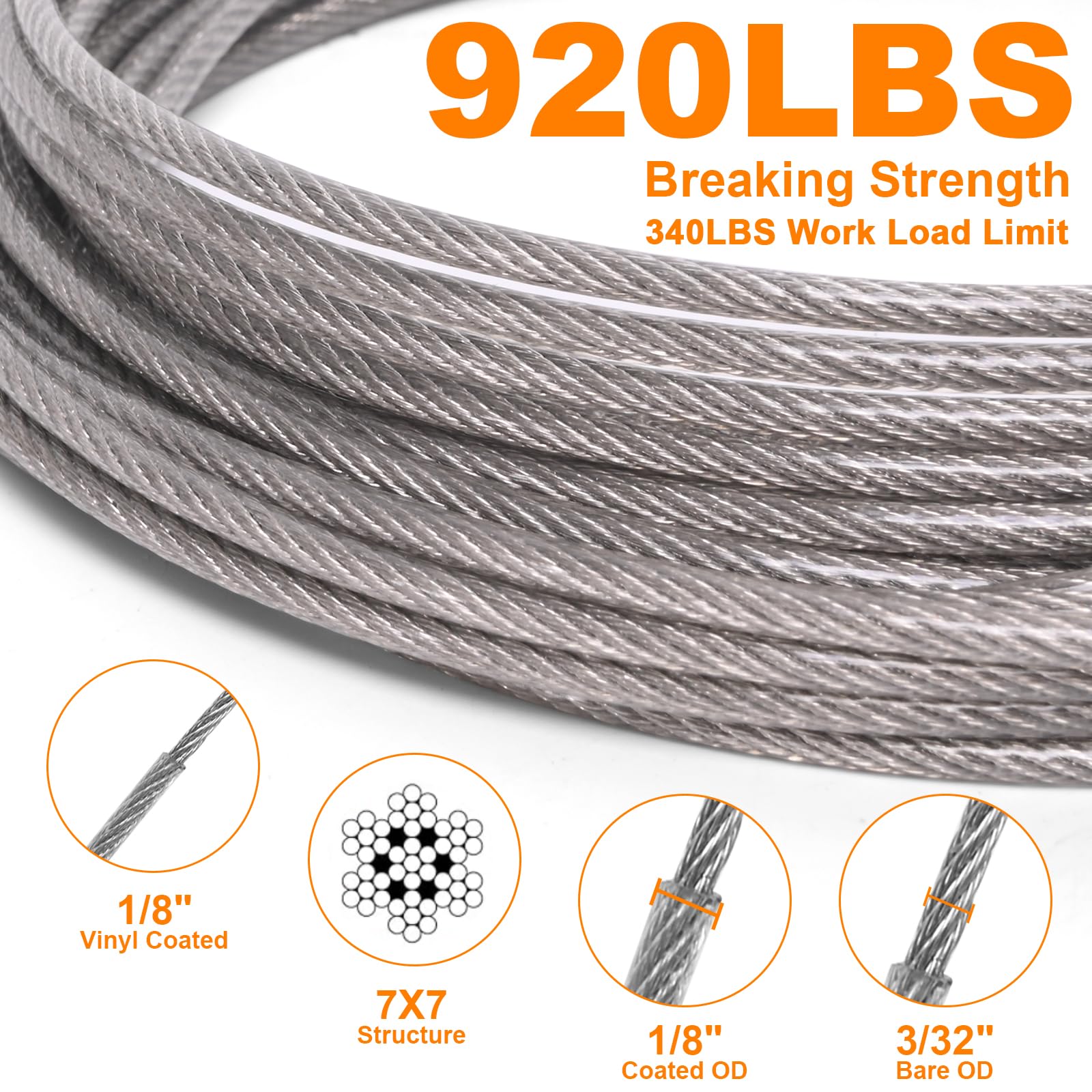 - 【1/8" Coated Stainless Steel Cable】Wire rope cable kit is made of 304 stainless steel and made by 7×7 strands construction core steel cable, Bare OD is 3/32", and Coated OD is 1/8". Breaking Strength is 920lb, Work Load Limit is 340lb, features insulation, strong weather resistance, waterproof, rust and corrosion resistance as well as strong toughness and durability.