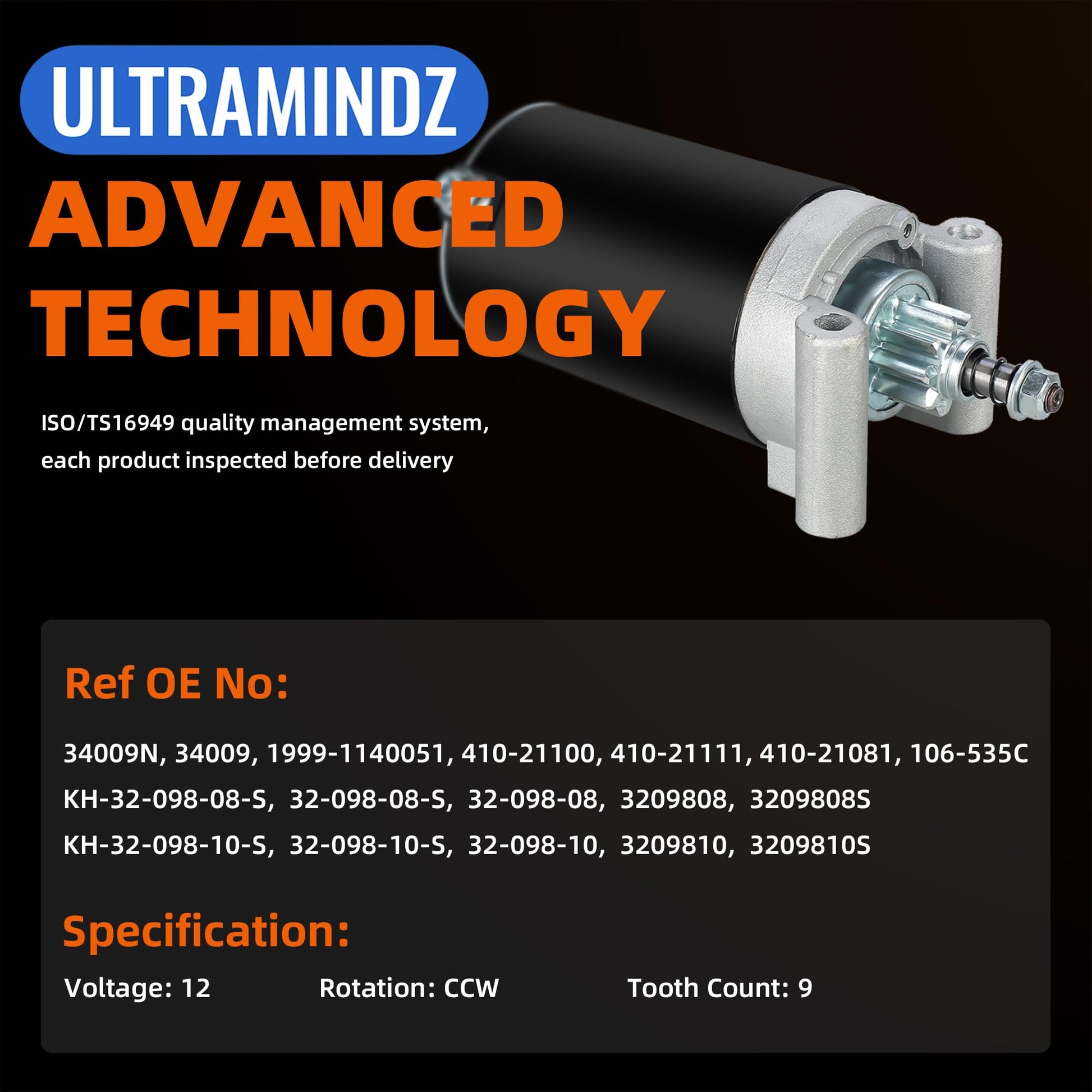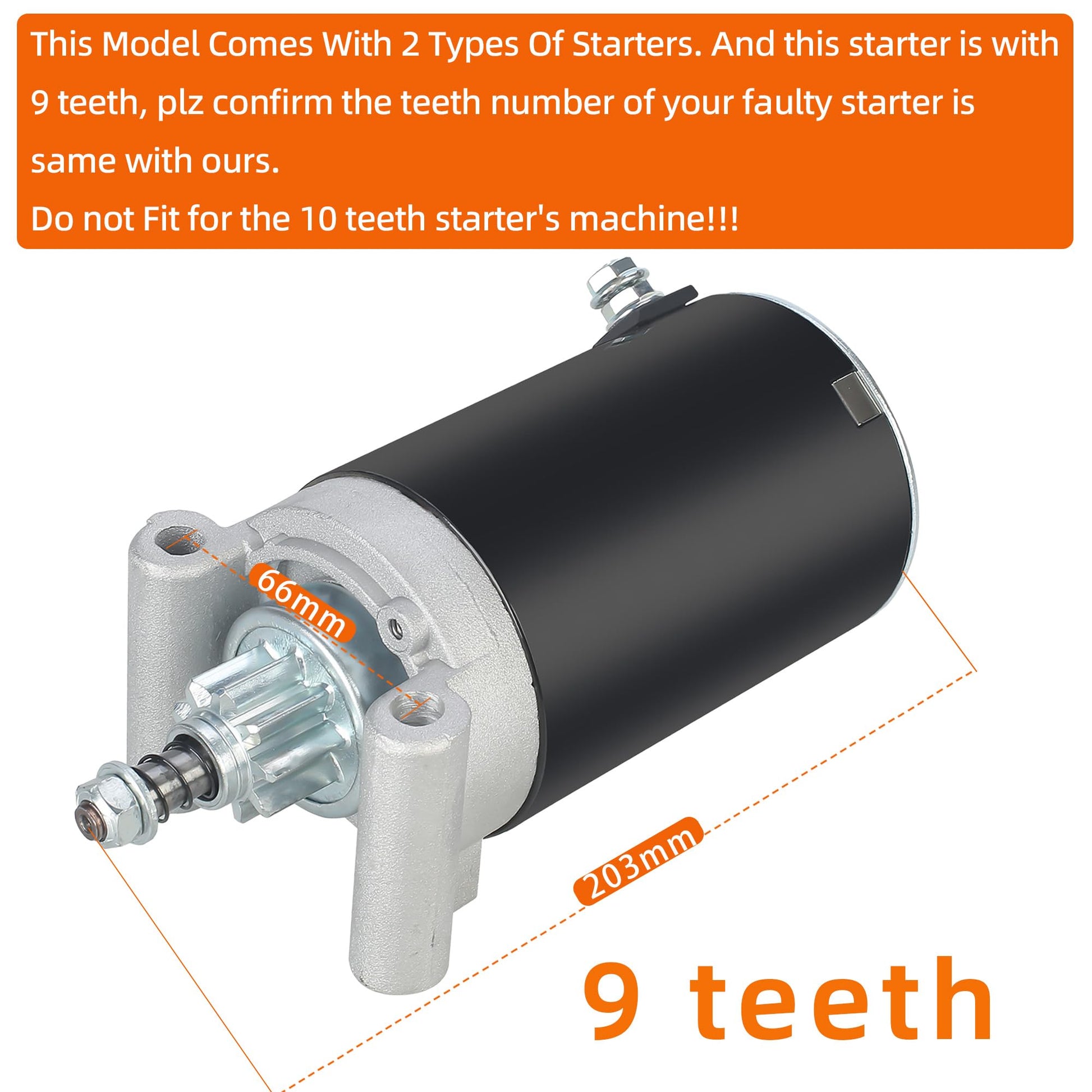 - This model comes with 2 types of starters. And this starter is with 9 teeth, plz confirm the teeth number of your faulty starter is same with ours. Do not fit for the 10 teeth starter's machine!!! Voltage: 12, Rotation: CCW, Teeth:9.