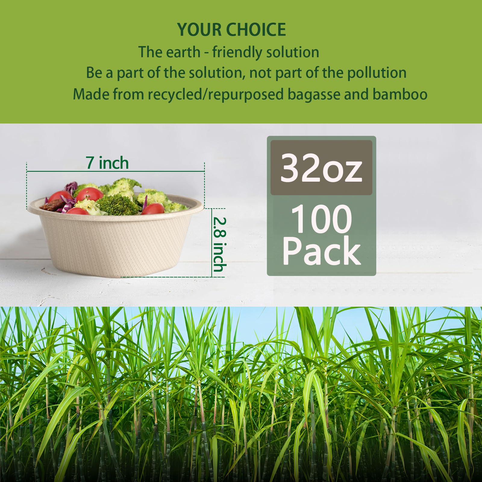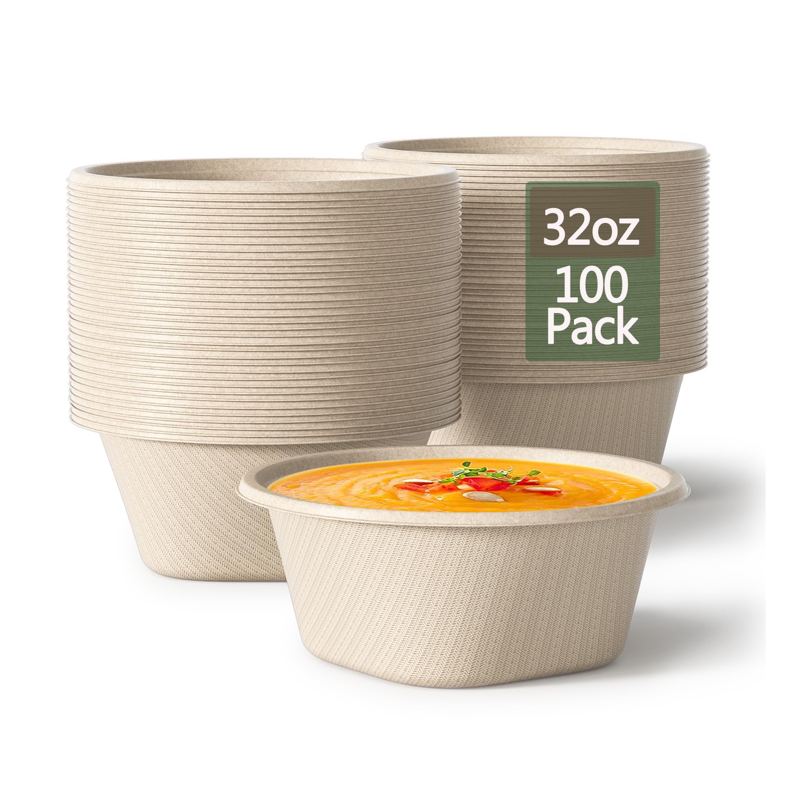 32 Ounce Large Paper Bowls Disposable Soup Bowl Disposable Heavy Duty Compostable Bowls, Eco-friendly Sugarcane and Bamboo Bagasse Biodegradable Bowl for Soup, Salad, Dessert, Ice Cream [100 Pack]