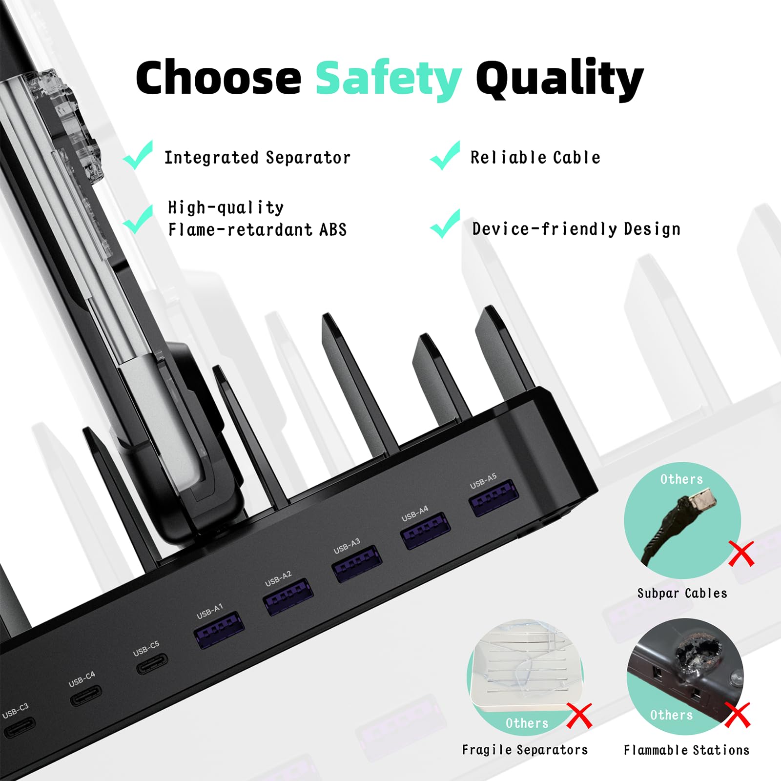 - 10-Port Charging Station Organizer: Unlike charging stations with only USB-A ports, our multi-device charging station features 5 USB-C ports, delivering a total output of up to 320W. It includes 8 short mixed charging cables and can conveniently store and charge up to 10 devices simultaneously. This phone charging station helps eliminate messy cables and the need for multiple wall chargers, keeping your desk tidy and organized.