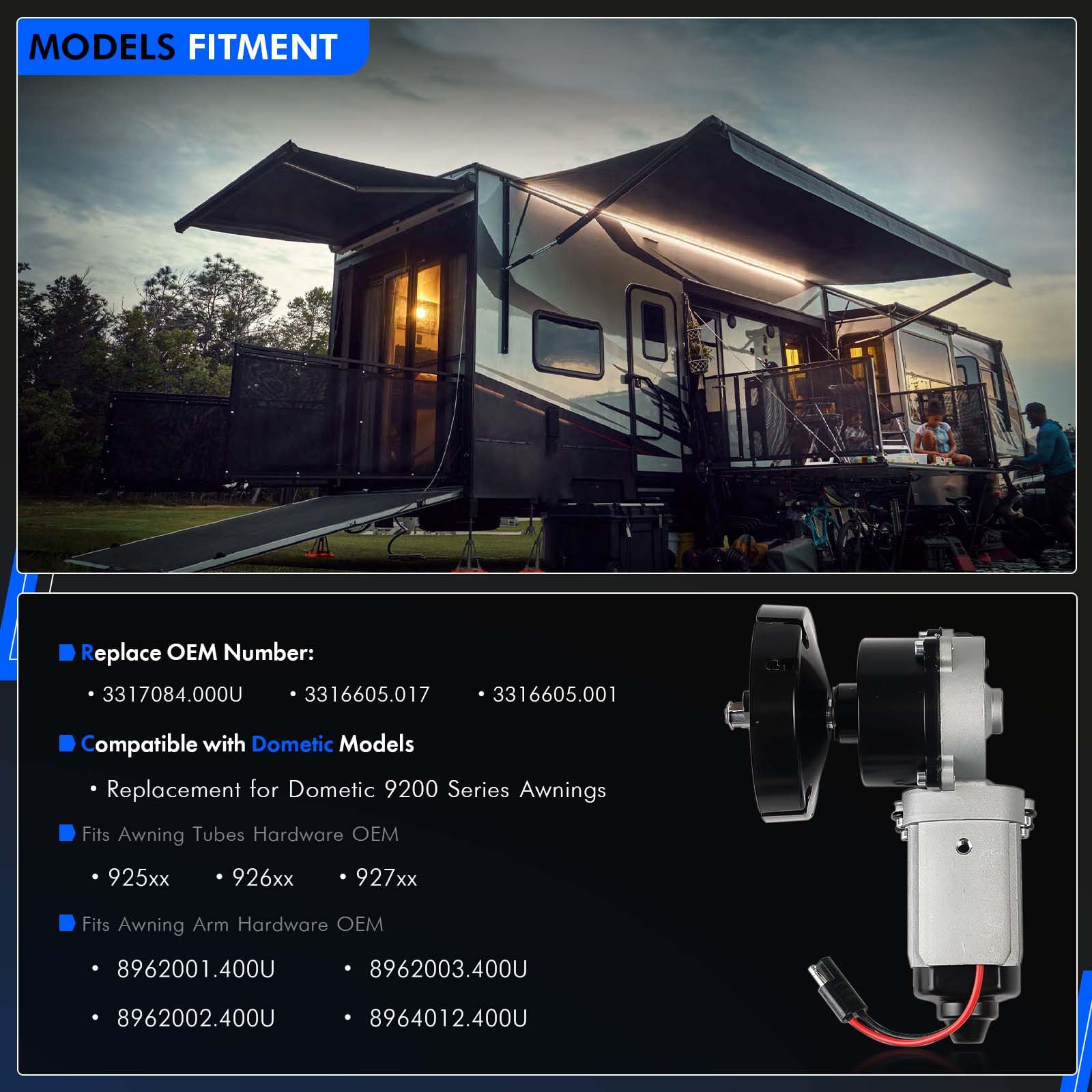 - Applicable Models: Compatible with Dometic 9200 series power awnings. Fit for Dometic Awning Tubes 925xx, 926xx, 927xx. Fit for Dometic Awning Arm Hardware Kit 8962001.400U, 8962002.400U, 8962003.400U, 8964012.400U