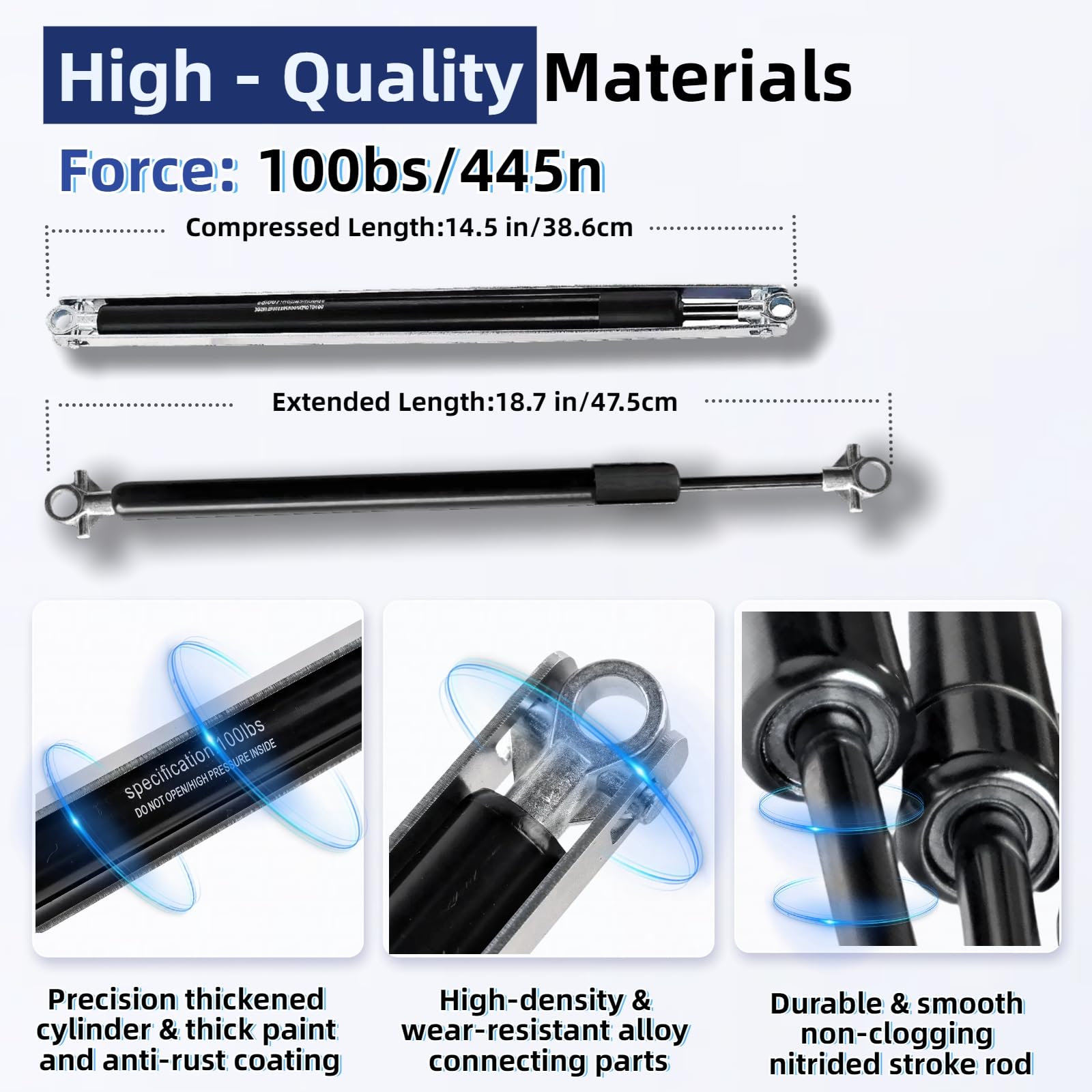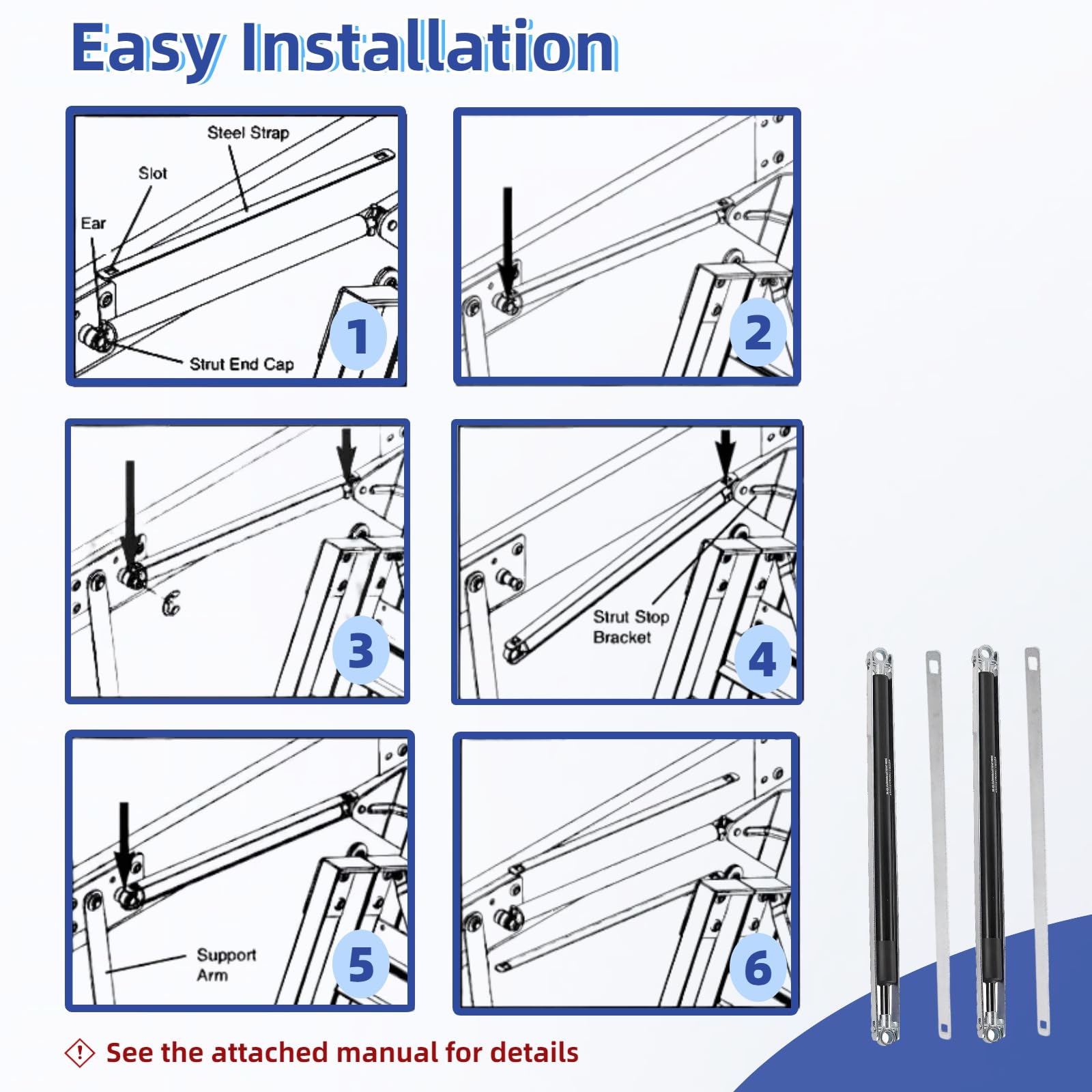 - Quick and Easy Installation: All necessary hardware is included for an easy and fast installation, including 2 x standard gas struts 36-80; 2 x steel straps; 8 x E-clips; 1 x Installation Manual for Quick Replacement