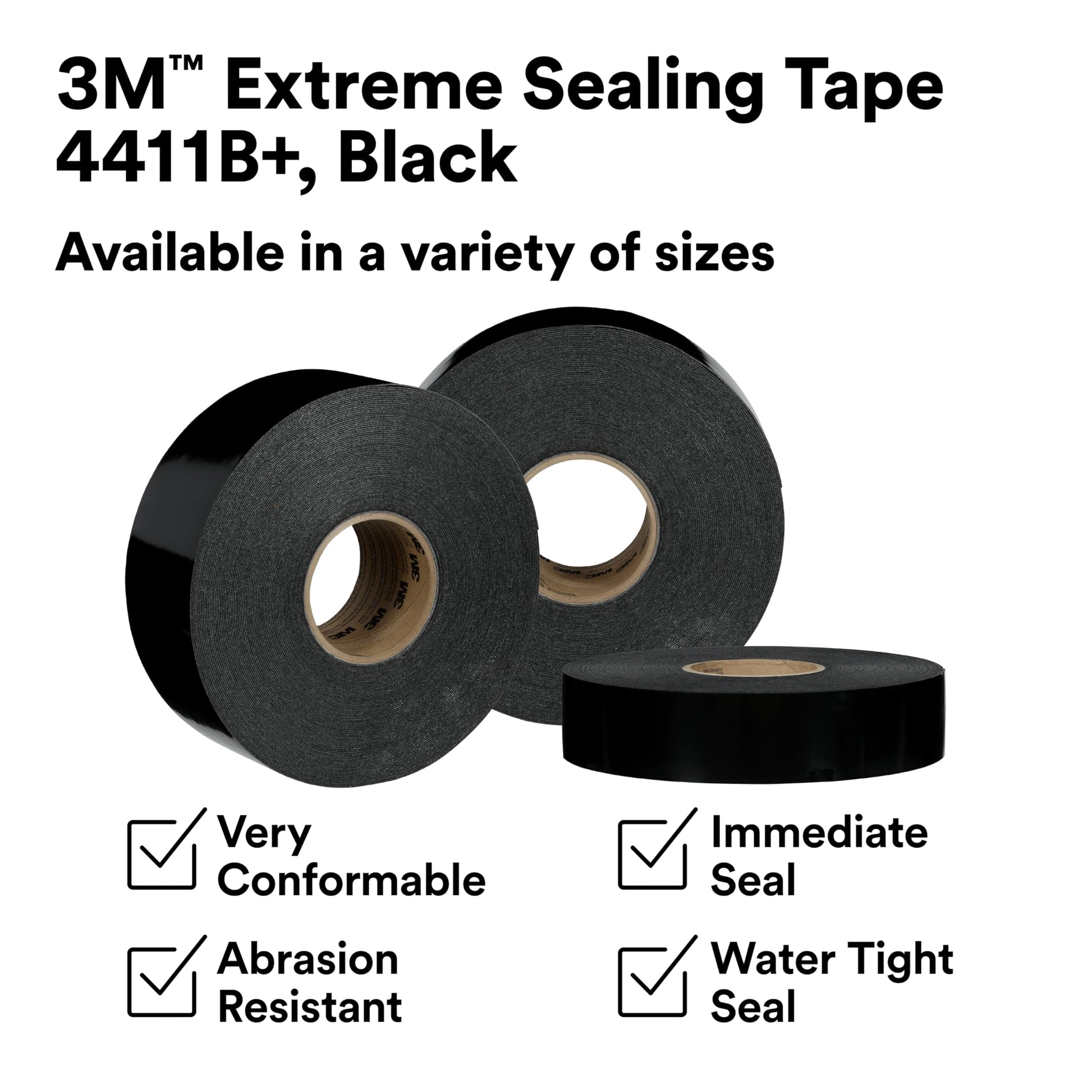Details: 3M™ Extreme Sealing Tape 4411B+ is a black, very conformable, single-sided, pressure sensitive acrylic adhesive tape featuring TPO backing. It is an ideal solution for creating a watertight seal. It conforms over fasteners, seams, joints, holes and gaps to ensure a long-lasting seal on a variety of substrates.