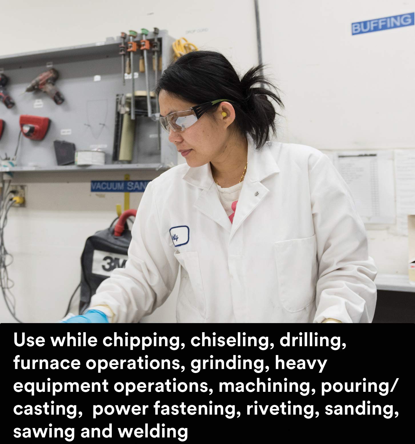 - VERSATILE: Use while chipping, chiseling, drilling, furnace operations, grinding, heavy equipment operations, machining, pouring/casting, power fastening, riveting, sanding, sawing and welding