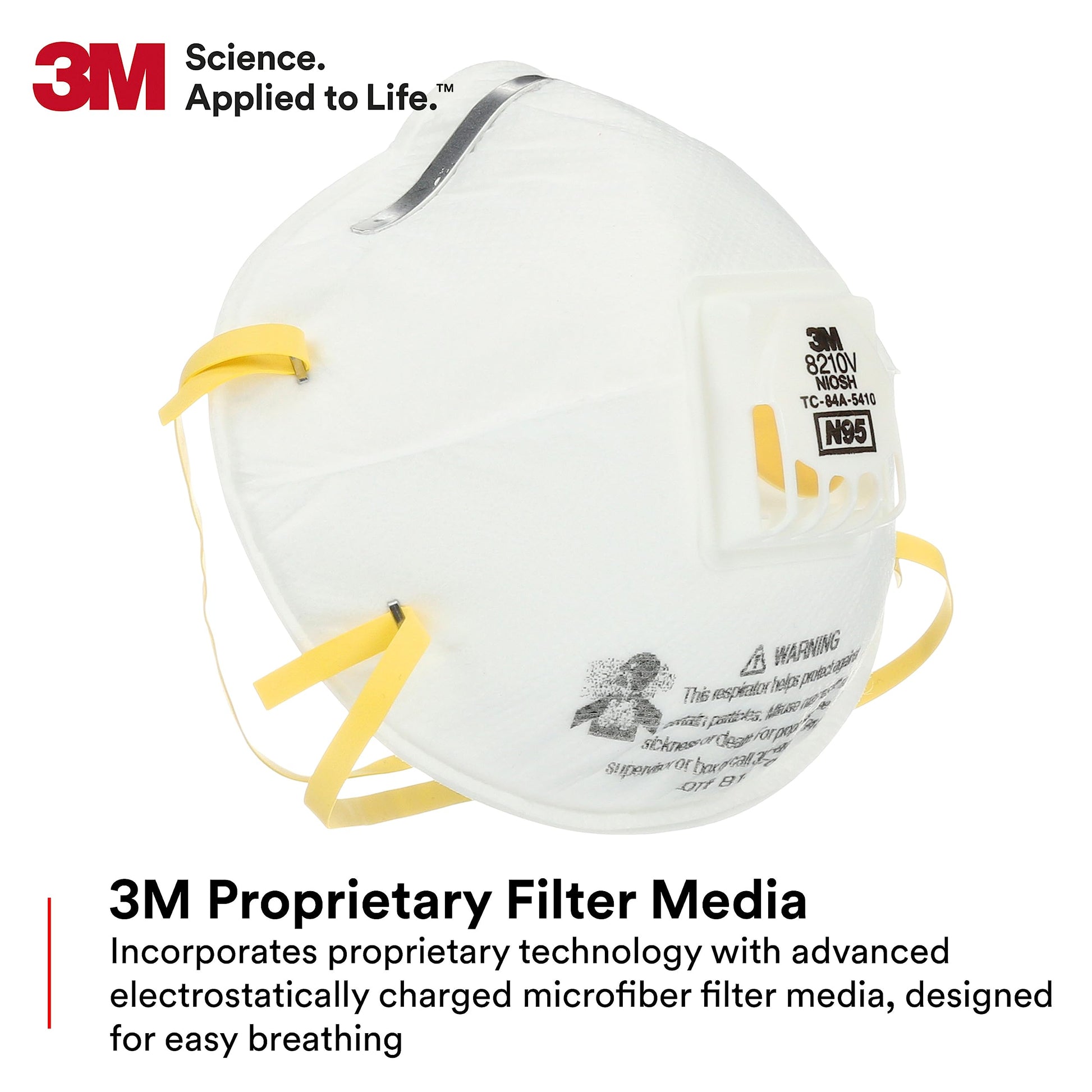 Details: Particulate Respirator 8210V, N95 is a NIOSH approved disposable particulate respirator that helps provide reliable respiratory protection of at least 95% filtration efficiency against certain non-oil based particles. This respirator is designed for use for particles such as those from grinding, sanding, sweeping, sawing, bagging, or other dusty operations. This respirator can also help reduce inhalation exposures to certain airborne biological particles (examples: mold, Bacillus anthracis, Mycobacterium tuberculosis), but cannot eliminate the risk of contracting infection, illness, or disease. The respirator incorporates 3M’s proprietary technology with advanced electrostatically charged microfiber filter media designed for ease of breathing. Designed with a 3M Cool Flow Exhalation Valve, this respirator may be appropriate for work situations involving heat, humidity, or long periods of wear. The proprietary 3M Cool Flow Valve is designed to release exhaled breath quickly, helping to prevent to enhance comfort for respirator wearers. Warning: Respirators help protect against certain airborne contaminants. Before use, the wearer must read and understand the User Instructions provided as a part of the product packaging. Follow all local regulations. In the U. S. , a written respiratory protection program must be implemented meeting all the requirements of OSHA 29 CFR 1910. 134 including training, fit testing and medical evaluation. In Canada, CSA standards Z94. 4 requirements must be met and/or requirements of the applicable jurisdiction, as appropriate. Misuse may result in sickness or death. Disclaimer: 3M industrial and occupational products are intended, labelled, and packaged for sale to trained industrial and occupational customers for workplace use. Unless specifically stated otherwise on the applicable product packaging or literature, these products are not intended, labelled, or packaged for sale to or use by consumers (e. g. , for home, personal, primary or secondary school, recreational/sporting, or other uses not described in the applicable product packaging or literature), and must be selected and used in compliance with applicable health and safety regulations and standards (e. g. , U. S. OSHA, ANSI), as well as all product literature, user instructions, warnings, and limitations. Misuse of 3M industrial and occupational products may result in injury, sickness, or death. For help with product selection and use, consult your on-site safety professional, industrial hygienist, or other subject matter expert. For additional product information, visit www. 3M /PPE.