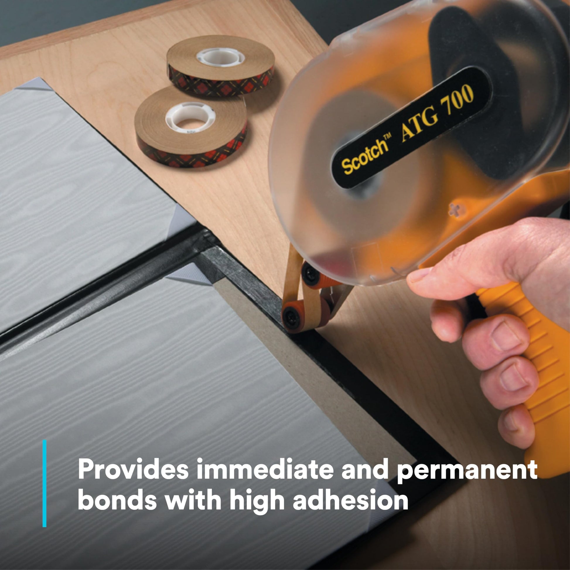 Details: Scotch ATG Adhesive Transfer Tape 924 quickly and permanently bonds a wide variety of materials including uncoated and coated paper, card stock, paper board, matting, lightweight fabrics, foils, flexible plastics and foam board. Offering high adhesion and excellent UV resistance, it easily bonds to difficult, varied and textured surfaces, including areas with high humidity and sunlight.