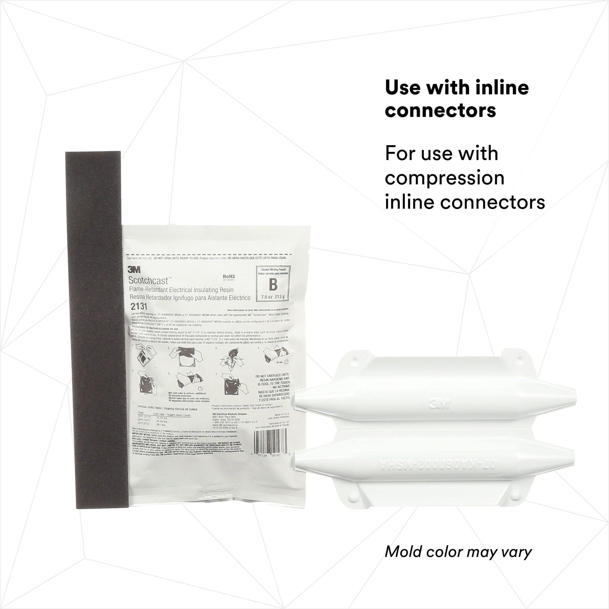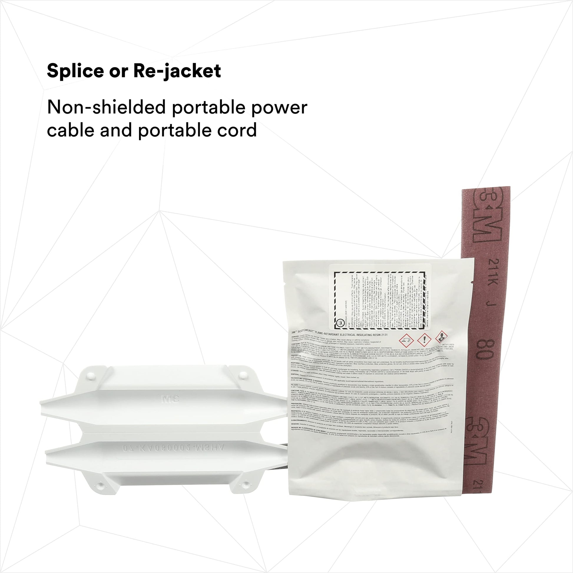 Details: 3M 82 F Series Resin Inline Cable Splice Kit includes ScotchRubber Splicing Tape 23, Scotchcast Compound 2131 and 3M Three-M-IteElek-Tro-CutAbrasive Cloth 80J grit. The semi flexible compound offers permanent splicing to bend with the cable for easy installation, reeling and handling. The smooth, tapered splice helps prevent cable hang ups and splice end lifting. The flame retardant Scotchcast Compound 2131 is a self-curing resin that bonds to itself and modern cable jackets. This kit is excellent for splicing 1 kV rated multiple conductors and 5 kV rated single conductors. RoHS Compliant.
