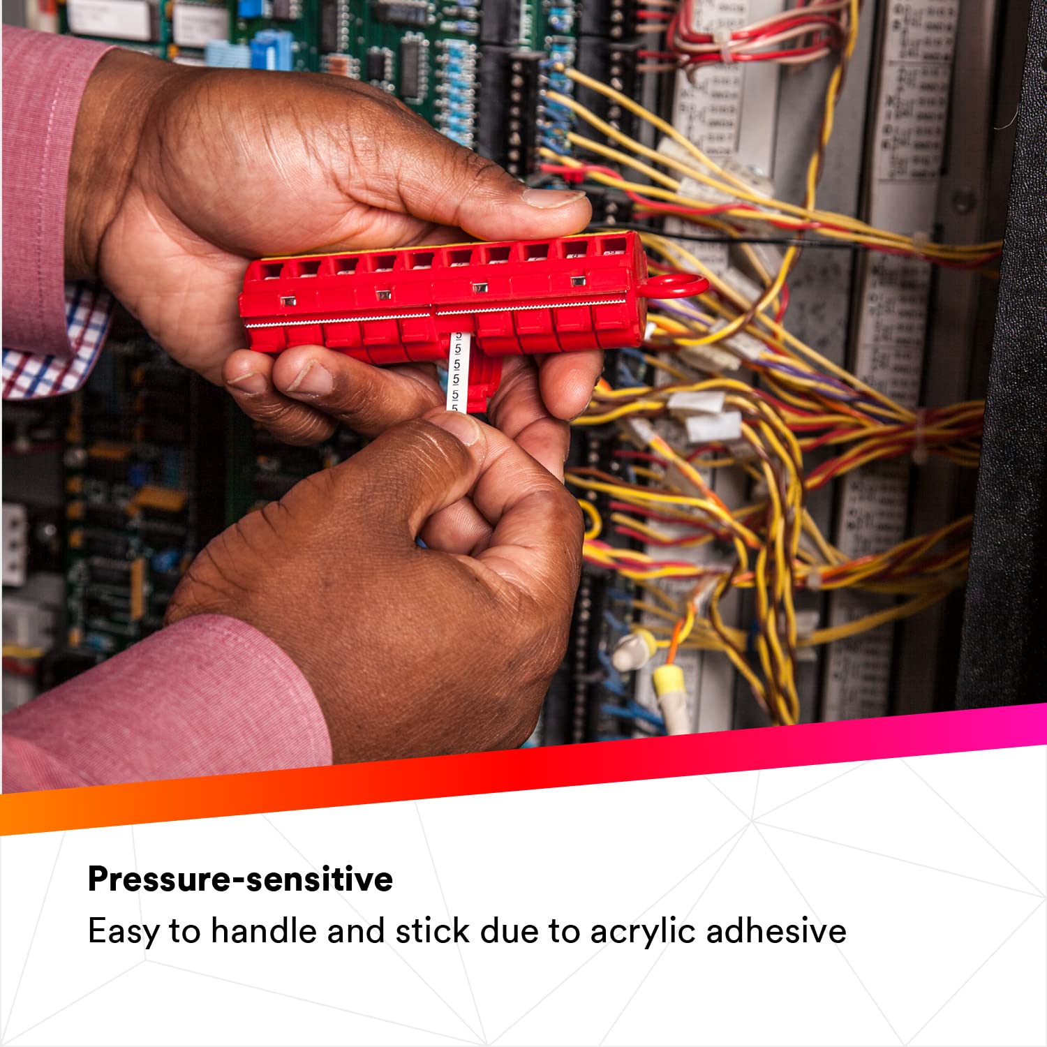 Details: 3M ScotchCode Wire Marker Tape Dispenser with Tape STD-0-9 has a compact design for easy handling and 10 refillable compartments to hold non-smear, polyester film tape rolls to use for marking wire and cable. Used for large wiring jobs, this carry-along dispenser is made of durable plastic construction and has an end loop that hooks easily to a tool pouch/belt for added convenience. The durable, pre-printed tapes are 3 mils (0.08mm) thick and are marked 0 through 9. They have a high-tack, acrylic adhesive to resist solvents, oil and water while adhering firmly to insulation surfaces. From the dispenser, you can pull out and tear off the amount of tape needed for applications such as marking wires, terminal blocks, panels and more. Use 3M ScotchCode Wire Marker Tape Dispenser with Tape STD-0-9 to easily keep track of wires during wiring work.