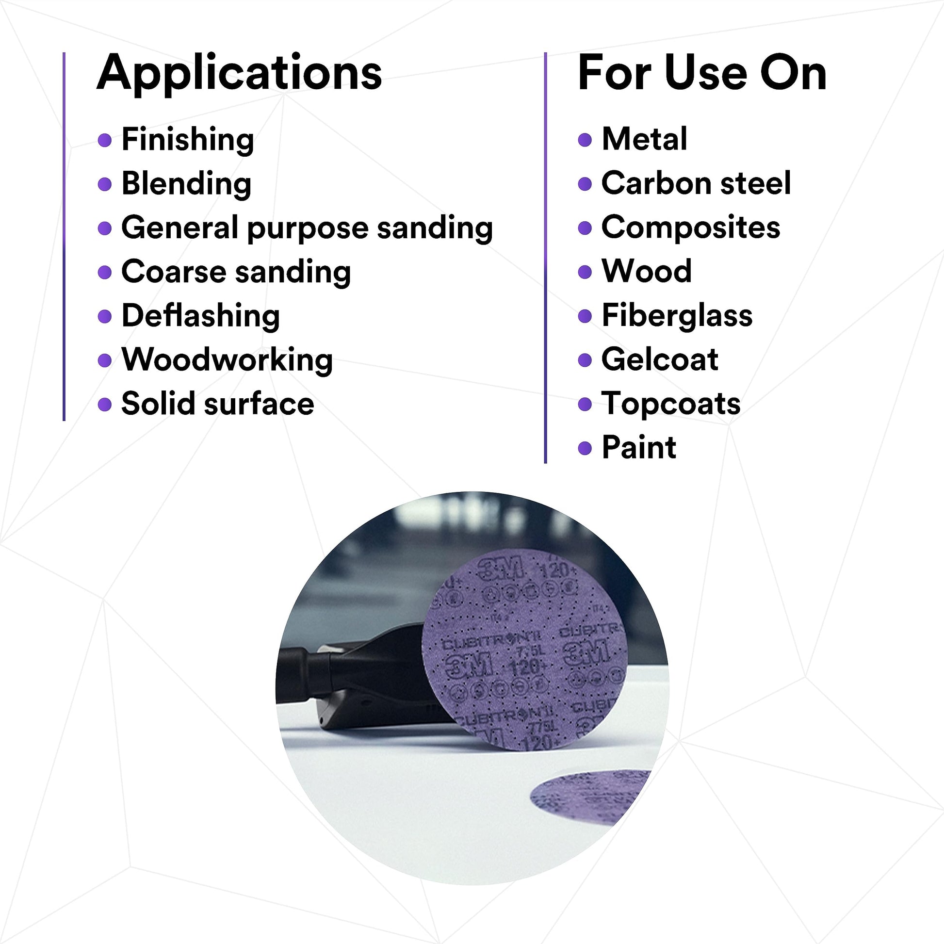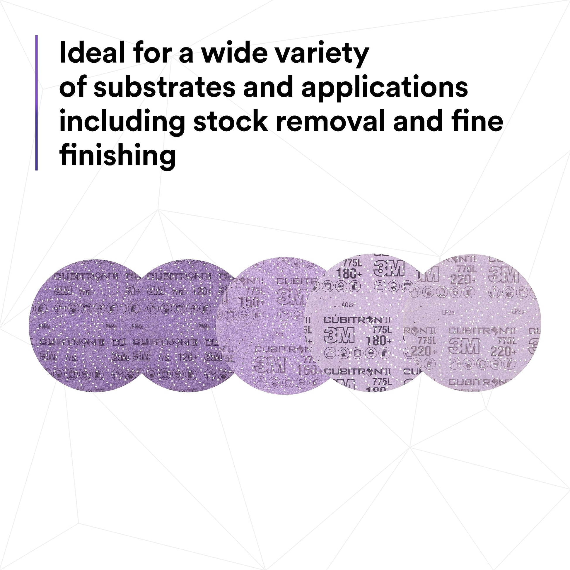 Details: 3M Cubitron II Hookit Clean Sanding Film Disc 775L features 3M Precision Shaped Ceramic Grain, a revolutionary advancement in abrasive technology. The triangular shaped ceramic mineral is designed to slice through the substrate, rather than gouging or “plowing” like conventional abrasives, resulting in a disc that cuts up to 2x as fast and lasts up to 6x as long as conventional abrasives.