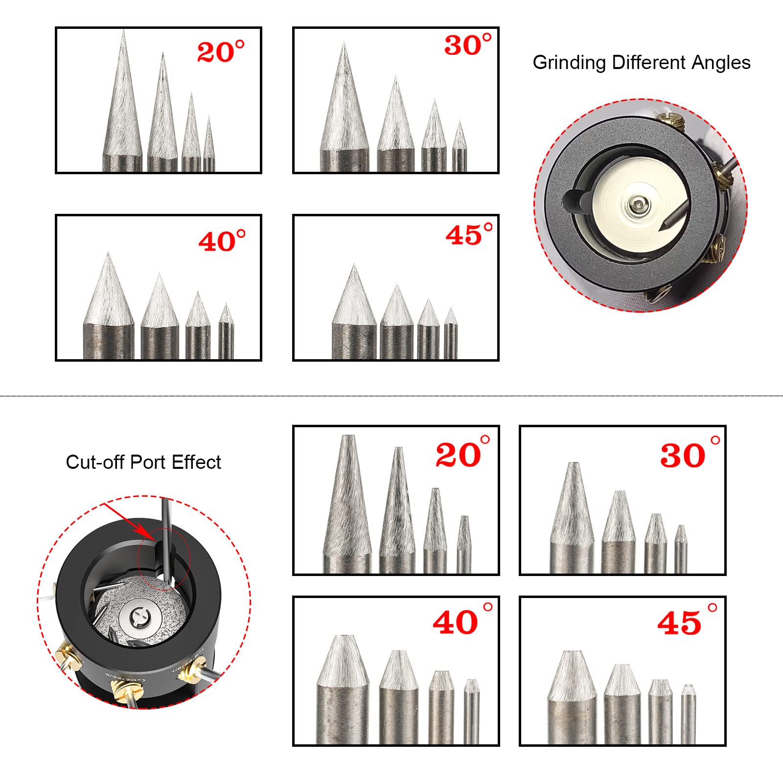 - 4 Size 4 Angles:This grinding head supports 6 sizes of tungsten electrode 040", 1/16", 3/32" and 1/8" (1mm, 1.6mm, 2.4mm, 3.2mm).4 angled holes:22.5°, 20°, 15° and 10° (45°, 40°, 30°, 20° Tips Angle respectively). The guides ensure concentricity and multi-offset.All grinding heads have been checked by precision measuring tools, Precise control makes Upgraded grinding tools will grind a More perfect tungsten tip angle.