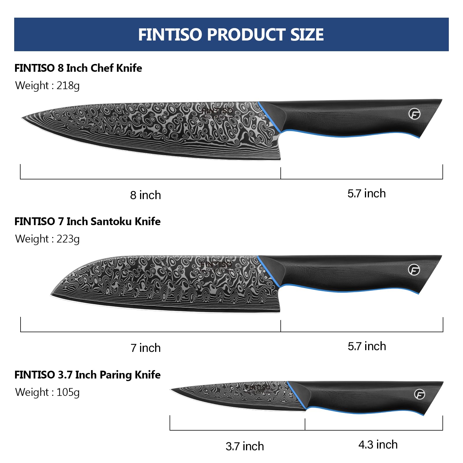 - 【Multifunctionality to Meet Various Needs】FINTISO chooses the most popular and sharpe knife set for you! 1*chef knife 1*Santoku knife 1*paring knife. Whether you are a professional chef or a home cooking enthusiast, our professional chef's knife can meet your various needs for food processing. From vegetables to meat, from fine cutting to fast chopping, one knife can handle it all