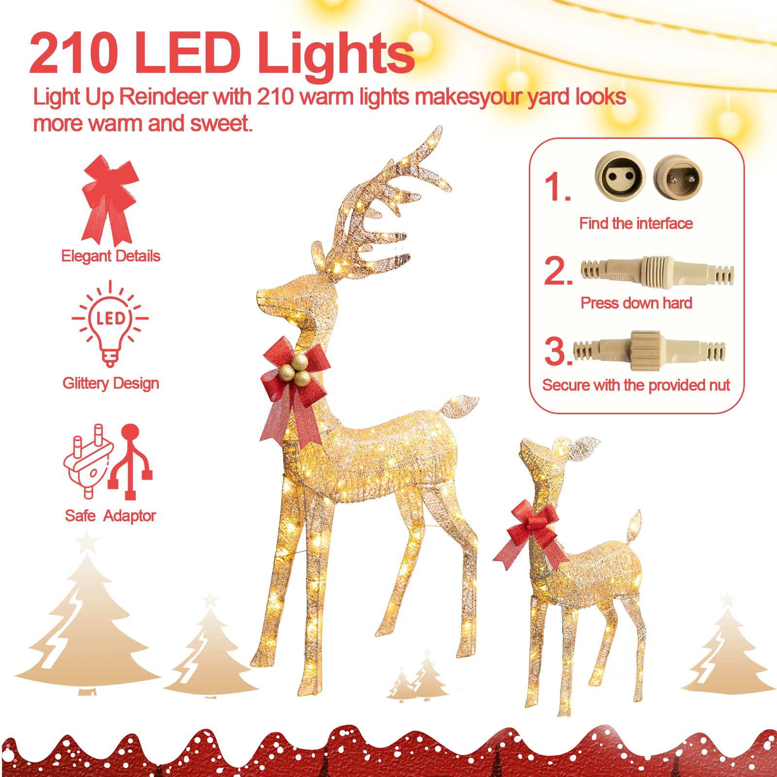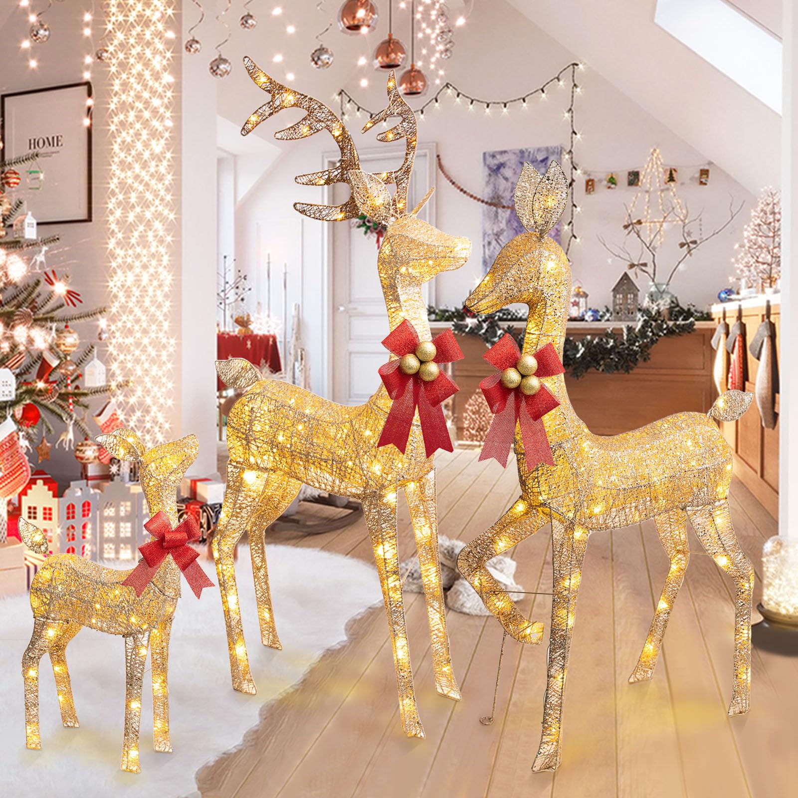 - Reindeer Family Set : You will receive a set of Christmas lighted reindeer family with red bows, which includes 1 buck, 1 doe and 1 fawn,The outdoor Christmas reindeer has built-in 210 LED lights.Measurments: Buck: 53”*29.5“*7.9“, Doe:48”*27.5“*7.9”, Fawn: 27.5"*18"*7.9"