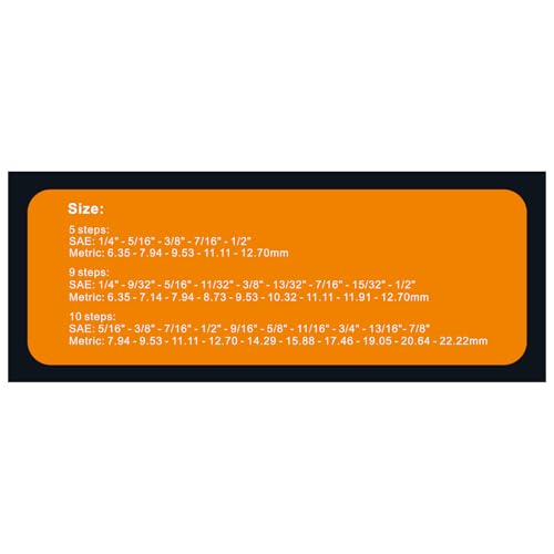 - VERSATILE 3PCS SET - Includes three step drill bits with varying sizes: #1 (1/4" - 5/16" - 3/8" - 7/16" - 1/2"), #2 (1/4" - 9/32" - 5/16" - 11/32" - 3/8" - 13/32" - 7/16" - 15/32" - 1/2"), and #3 (5/16" - 3/8" - 7/16" - 1/2" - 9/16" - 5/8" - 11/16" - 3/4" - 13/16"- 7/8"). These metal drill bits come in a box so they can be storage well.