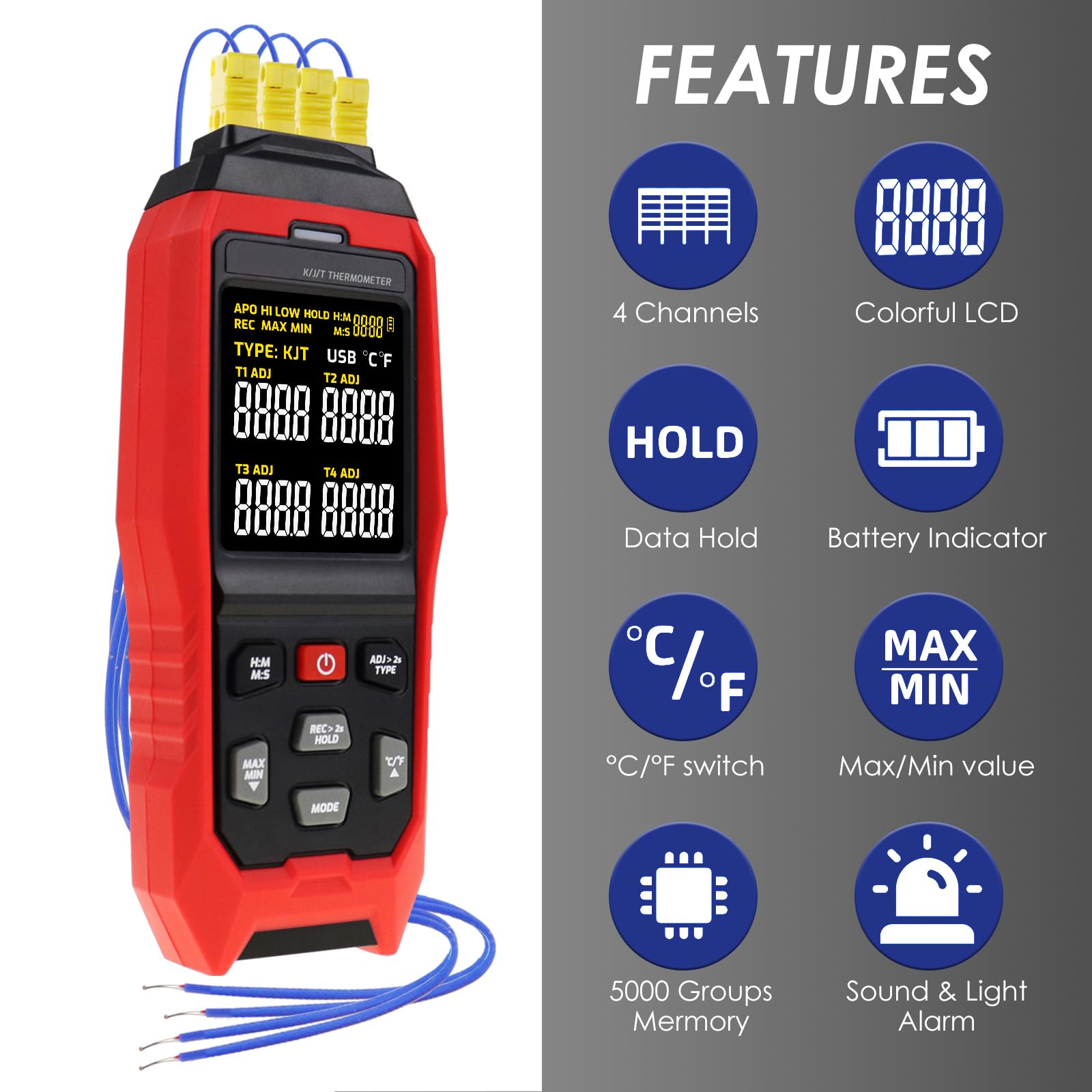 4-Channel Thermocouple Thermometer DataLogger, Digital K/J/T Type Thermometer with 5000 Groups Programmable Temperature Data Logging in Range of -328~2501℉, 4 K-Type thermocouples, ADJ Compensation