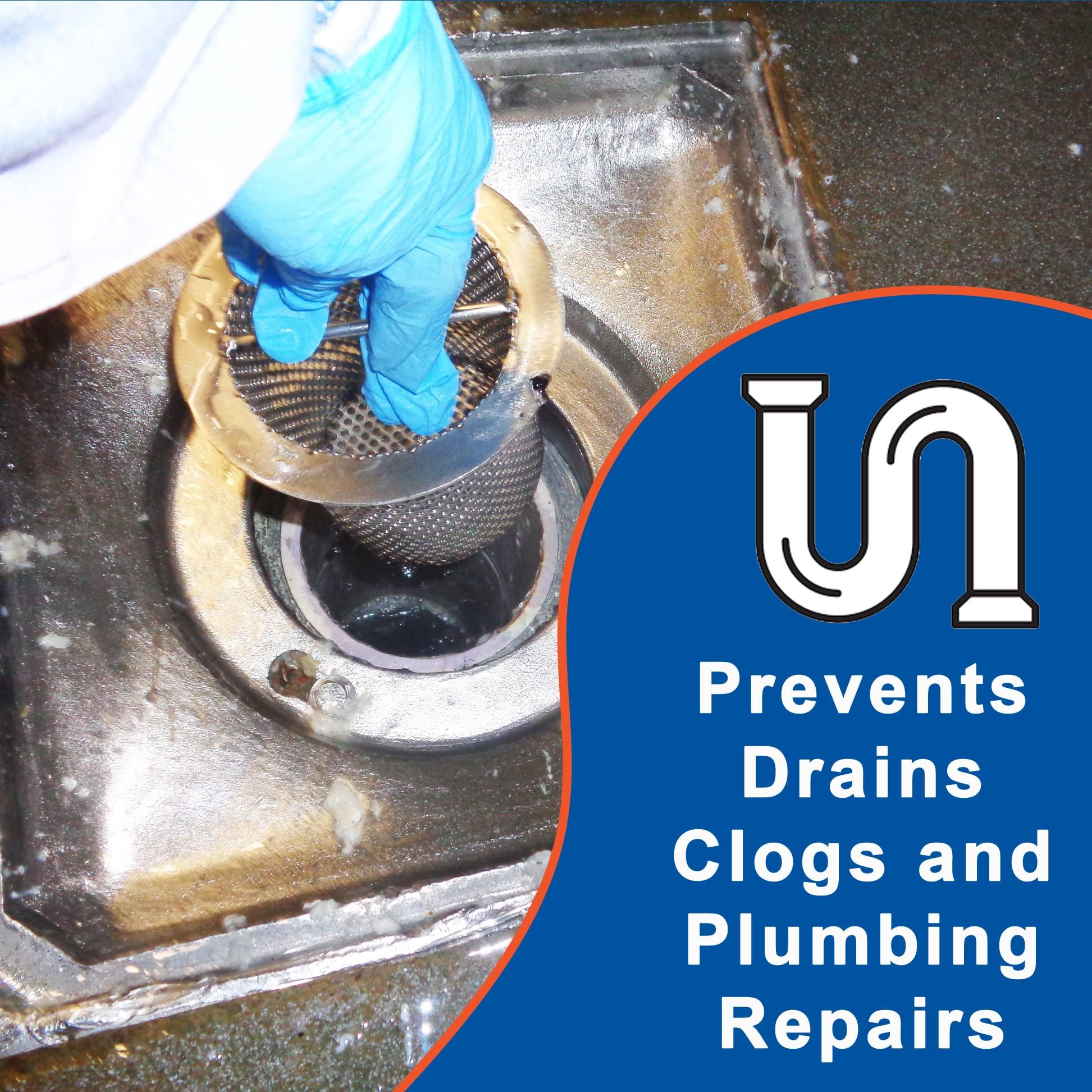 - Helps prevent facility drain clogs and backups in the pipes and plumbing system