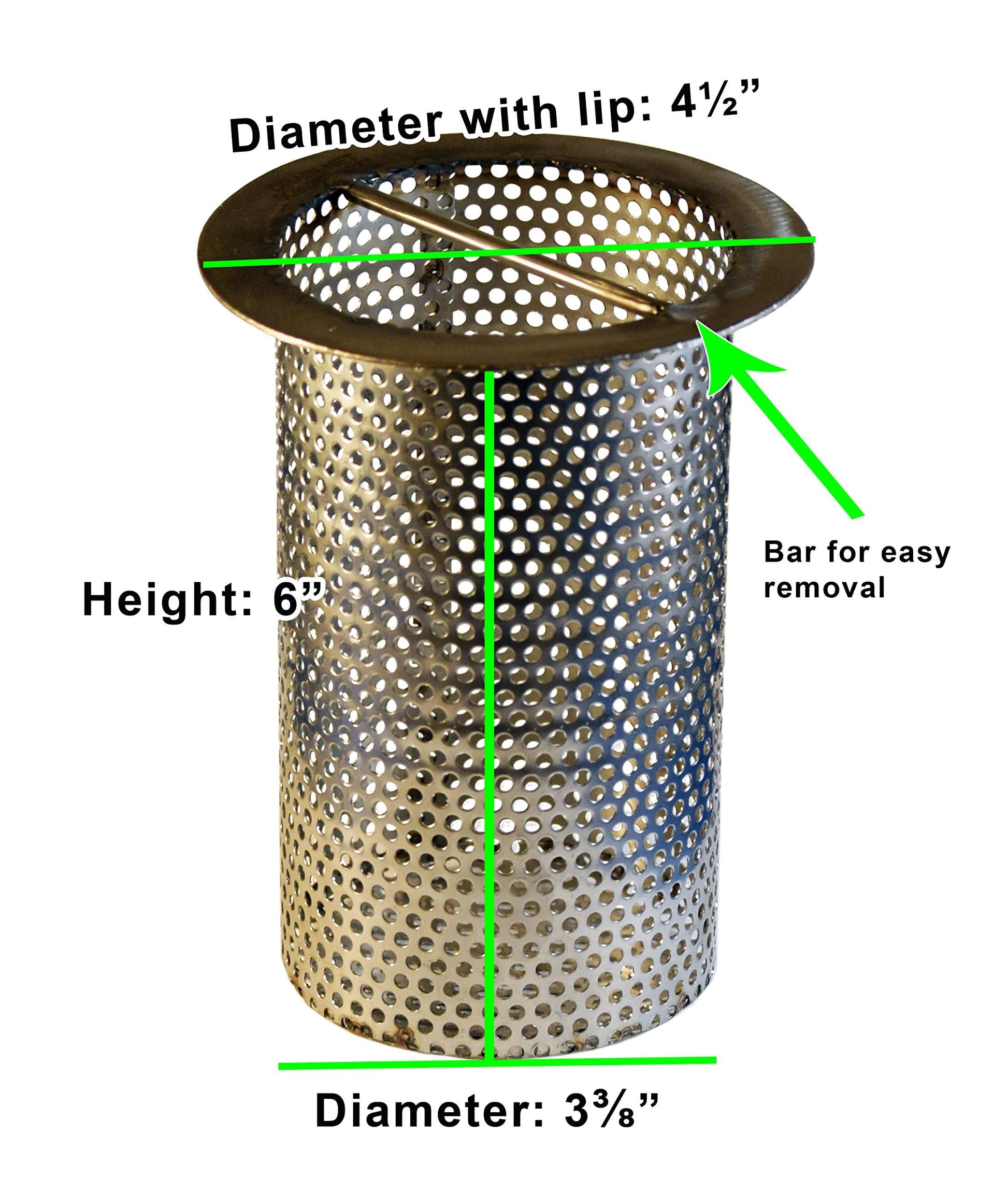 - Diameter with lip: 4 1/2" | Diameter of strainer: 3 3/8" | Height: 6" | ⅛” perforations