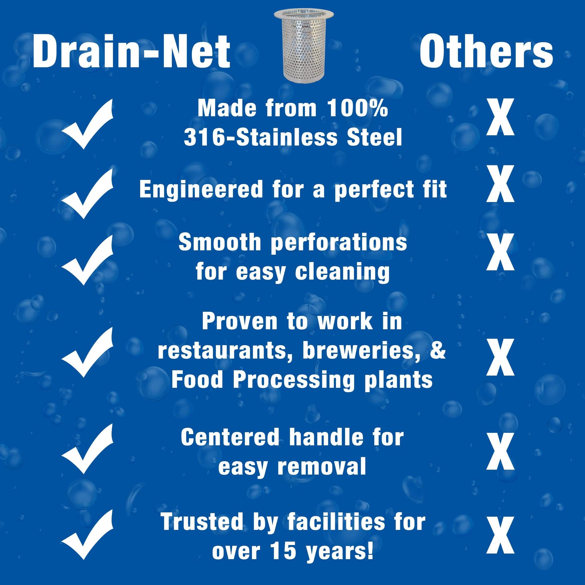 Details: This commercial grade strainer keeps food solids, trash, and other debris out of floor drains. Helps prevent drain clogs, plumbing problems and plumbing repairs. Perfect for restaurants, food processing plants, and other facilities. Features bar handle for easy removal. Fits most 4" drains. Please measure drains before ordering.