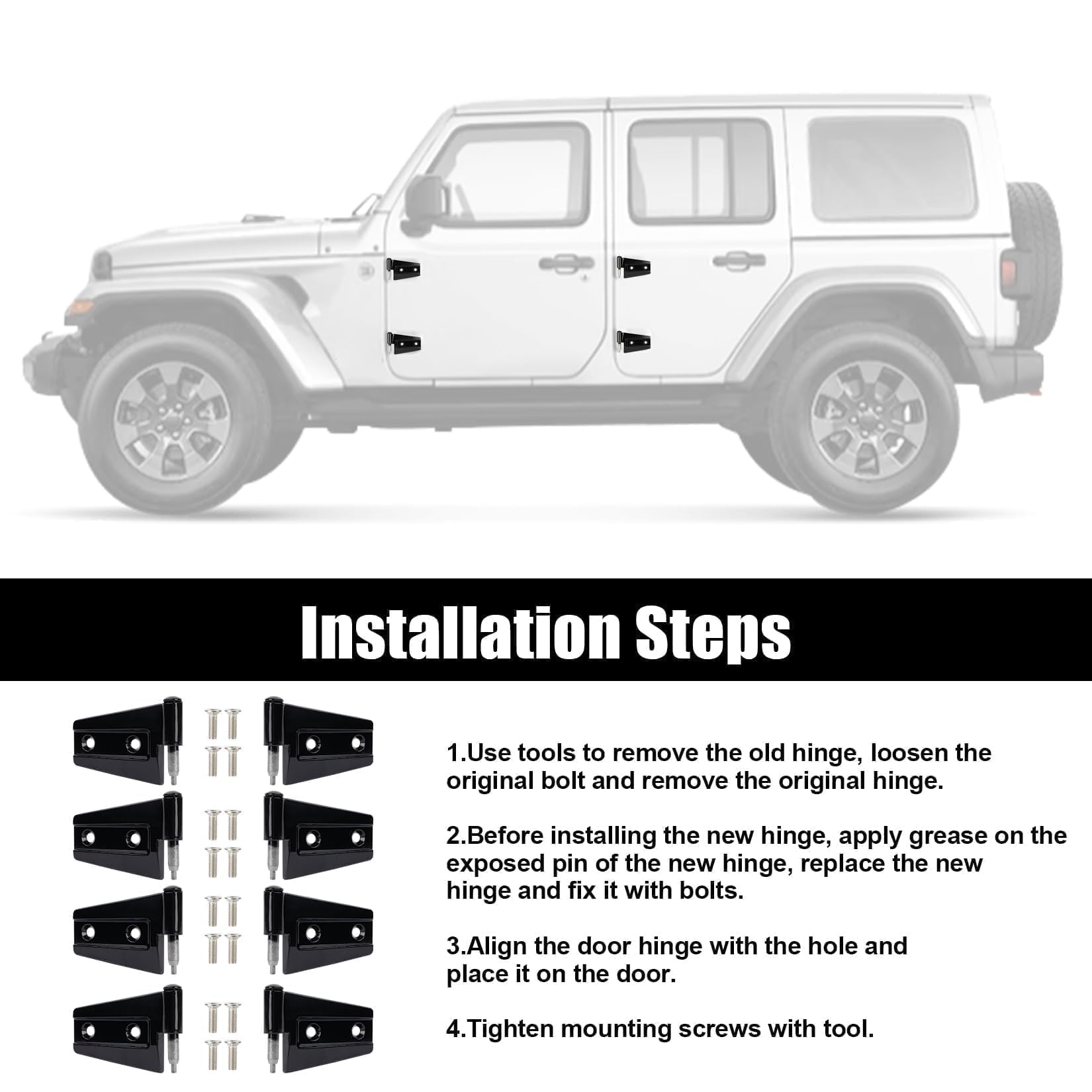 - The Jeep Wrangler door hinge installation process is straightforward and matches the original door components.Remove old hinges, install new ones using provided hardware, adjust the angle, and secure.