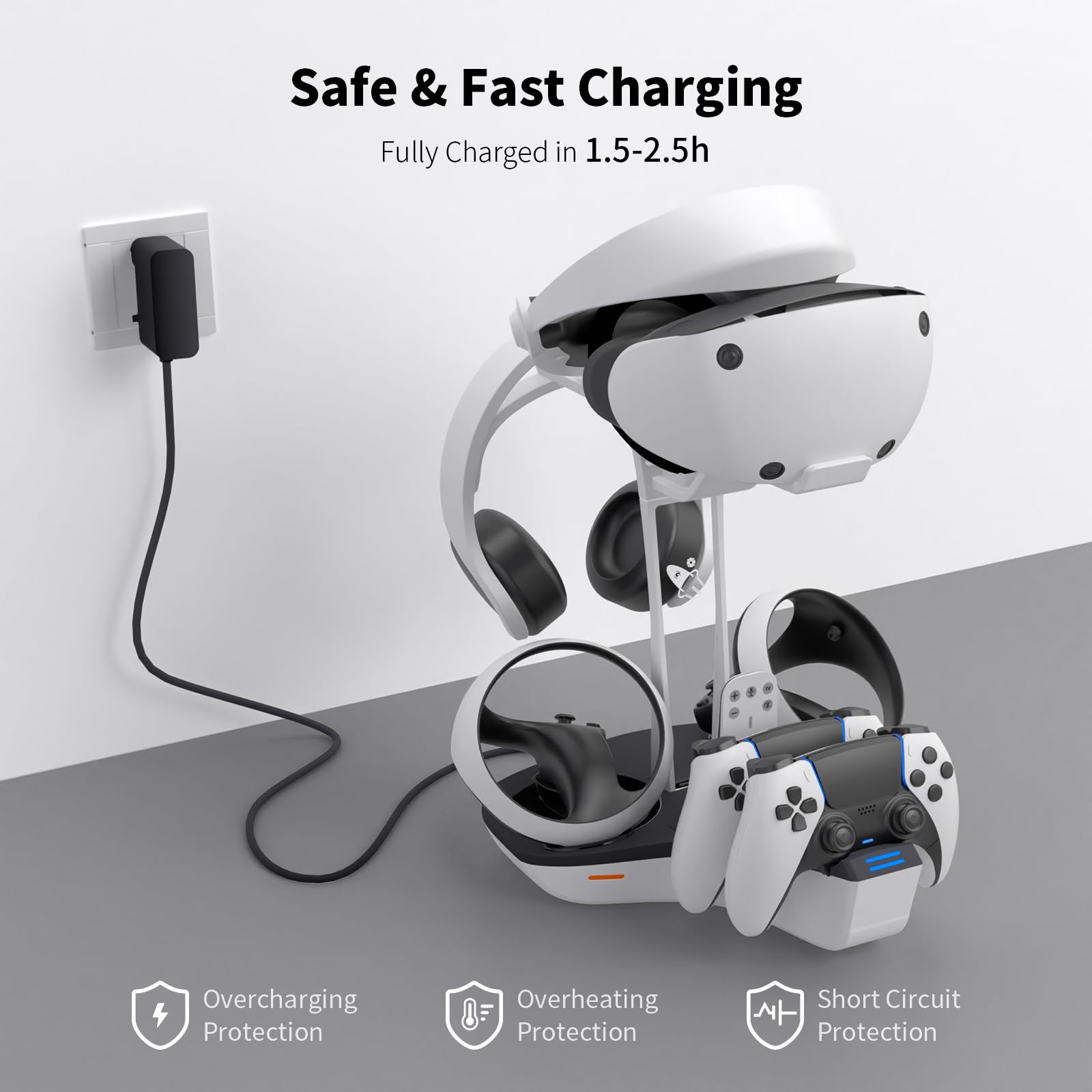 4-in-1 Controller Charging Station for PSVR2 and PS5, Dual Charging Dock with VR Headset Display Holder and Headphone Rack, LED-Charging Indicator, AC Power Adapter, RGB Lights, 3 Magnetic Connector