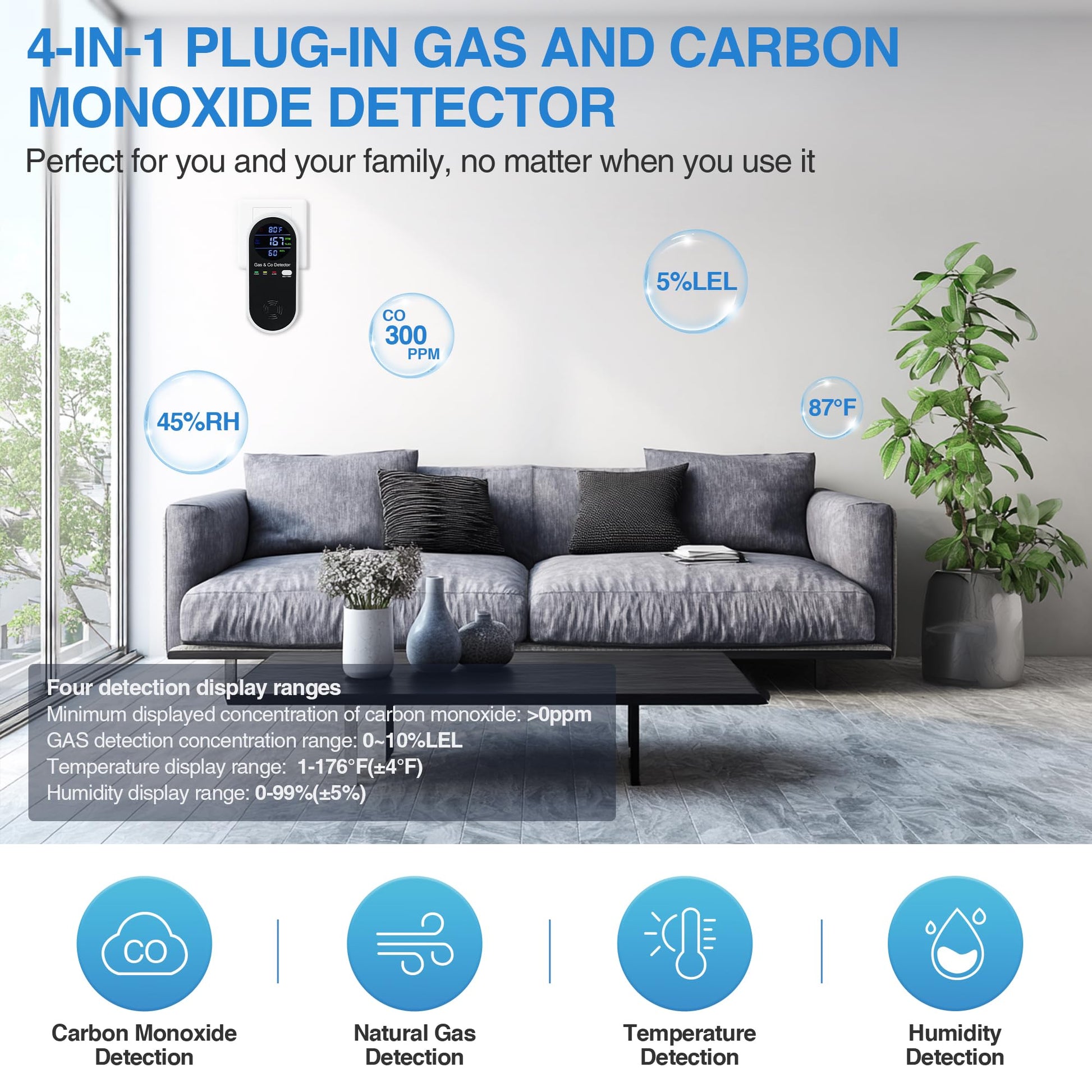Details: This upgraded 4-in-1 gas and carbon monoxide detector combines CO, combustible gas, temperature, and humidity sensors in one compact device. Perfect for homes, kitchens, apartments, and RVs, it offers reliable, real-time monitoring and loud alarms to keep you and your family safe. Plug-and-play design with a clear full-color LCD makes it easy to use anywhere, anytime.