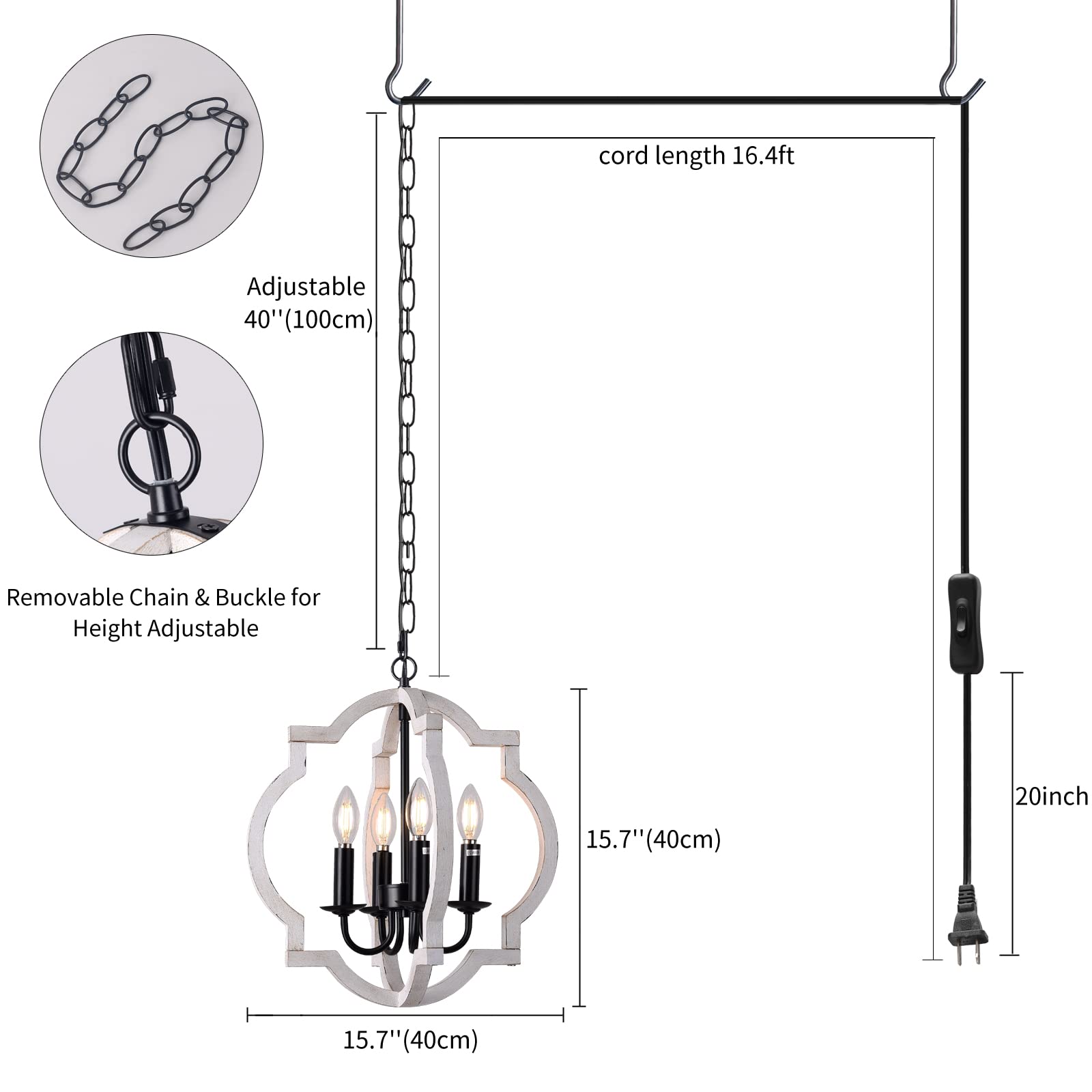- 【Wooden Farmhouse Plug in Chandelier】This 4-light plug-in chandelier in oak and rustic style features the iconic sphere silhouette. Distressed hand painted wood finish with rustic flecks. The 16.4-foot cord with plug switch is long enough to quickly bring rustic retro style decor and lighting to your home without the expense of an electrician