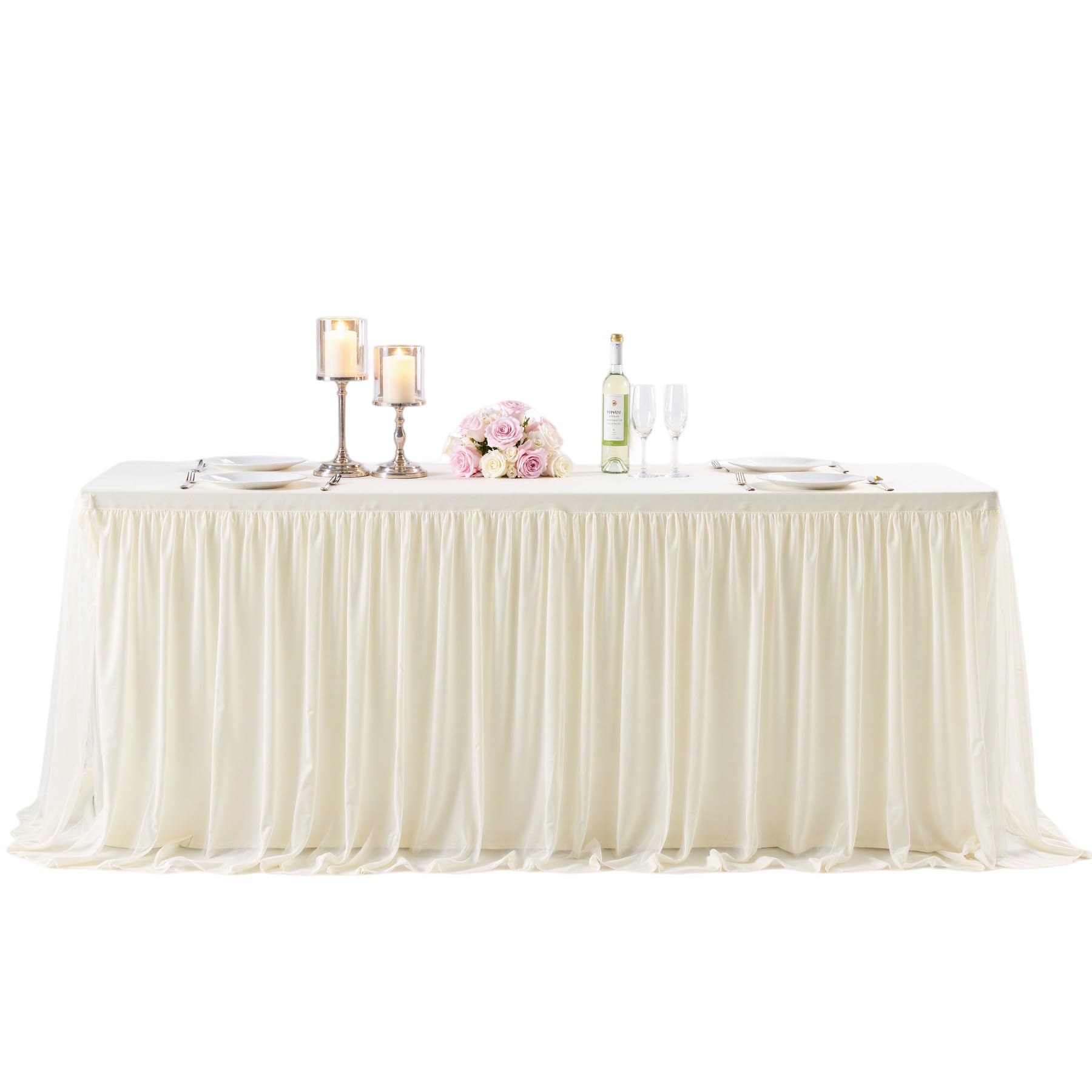 - Ivory Tablecloth with Skirt One-Piece Design : Ivory tulle tablecloth consists of a simple ivory spandex tablecloth with one layer of ivory tulle. Ivory tutu tulle table cloth will give you the romantic elegant atmosphere. This is a high end deluxe table cloth, great decoration for your table and make your party and home much more elegant and more warm.