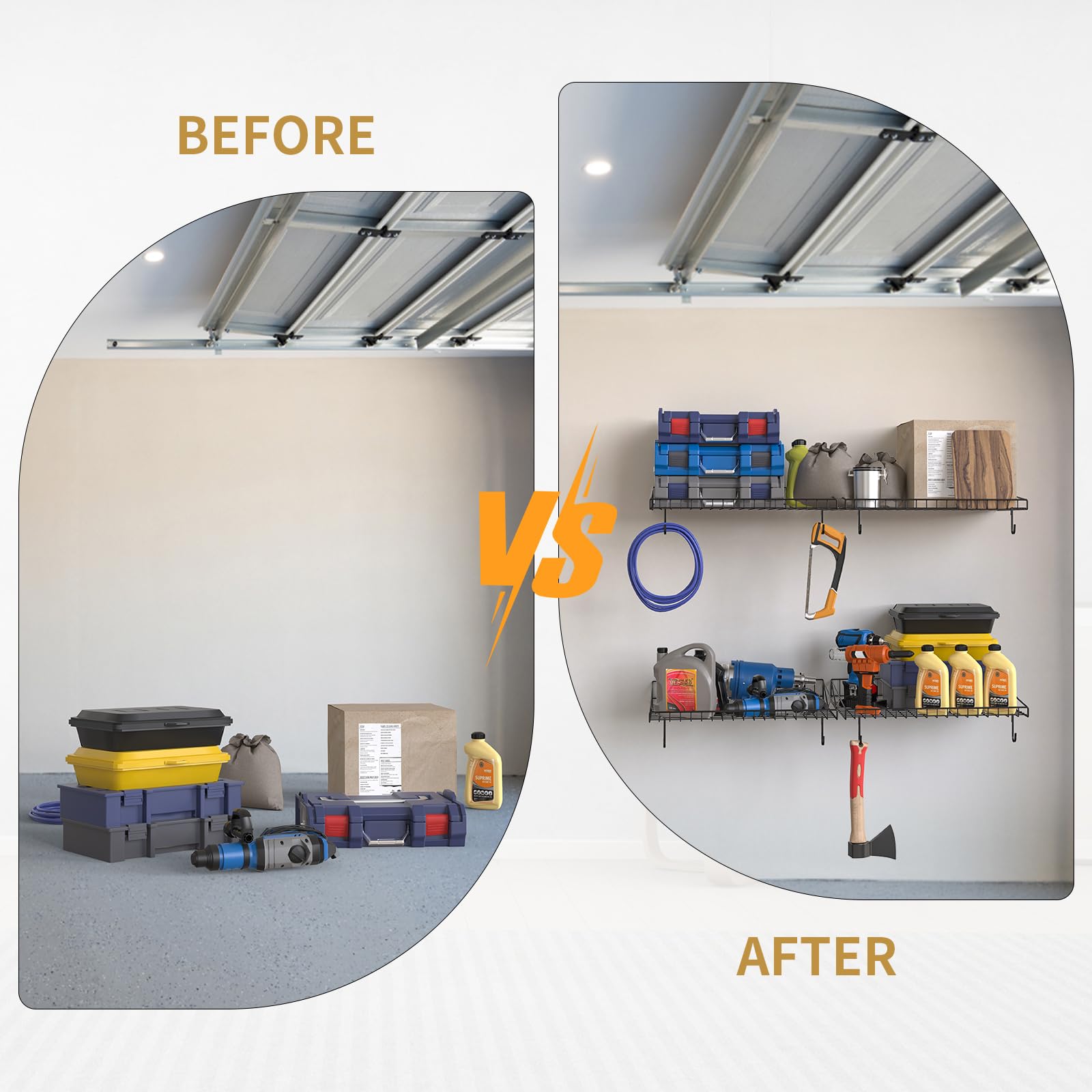 - HEAVY DUTY METAL WALL SHELF: Hanging Garage Wall Shelf is made of high-quality steel with a powder-coated finish for a sturdy structure. After extensive load-bearing testing, each metal rack has a load-bearing extent of 45 pounds, and 4 metal racks have a load-bearing extent of 180 pounds, providing a sturdy and secure storage solution for your valuables.