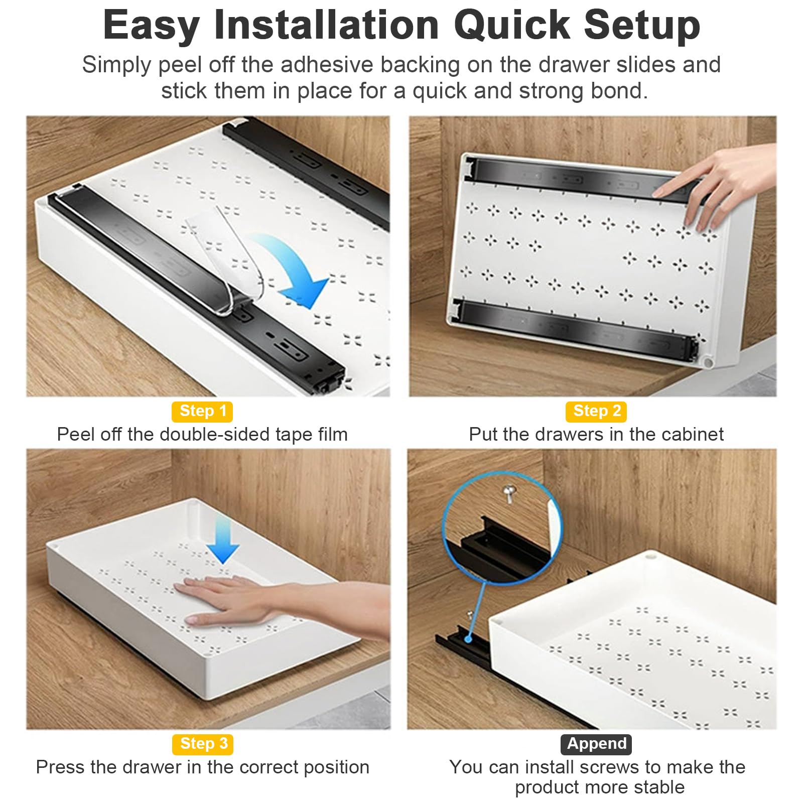 - EFFORTLESS INSTALLATION FOR QUICK SETUP: Installation is a breeze with our pull-out drawers! Simply peel off the adhesive backing on the drawer slides and stick them in place for a quick and strong bond. For added security, screws are included to further reinforce the drawers if needed. This straightforward setup process ensures that your new storage solution is up and running in no time without the need for complicated tools or professional help