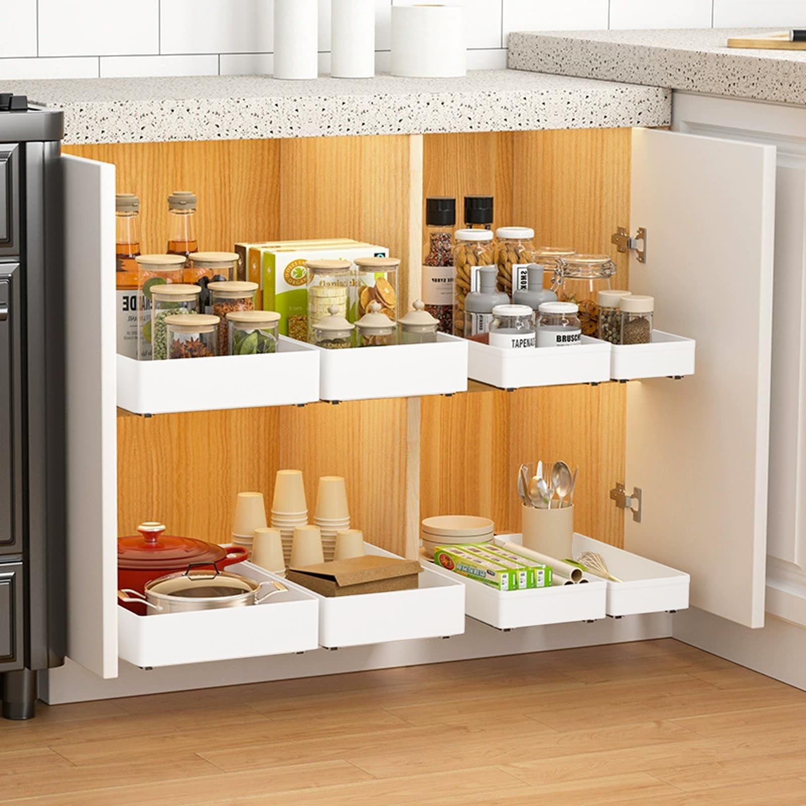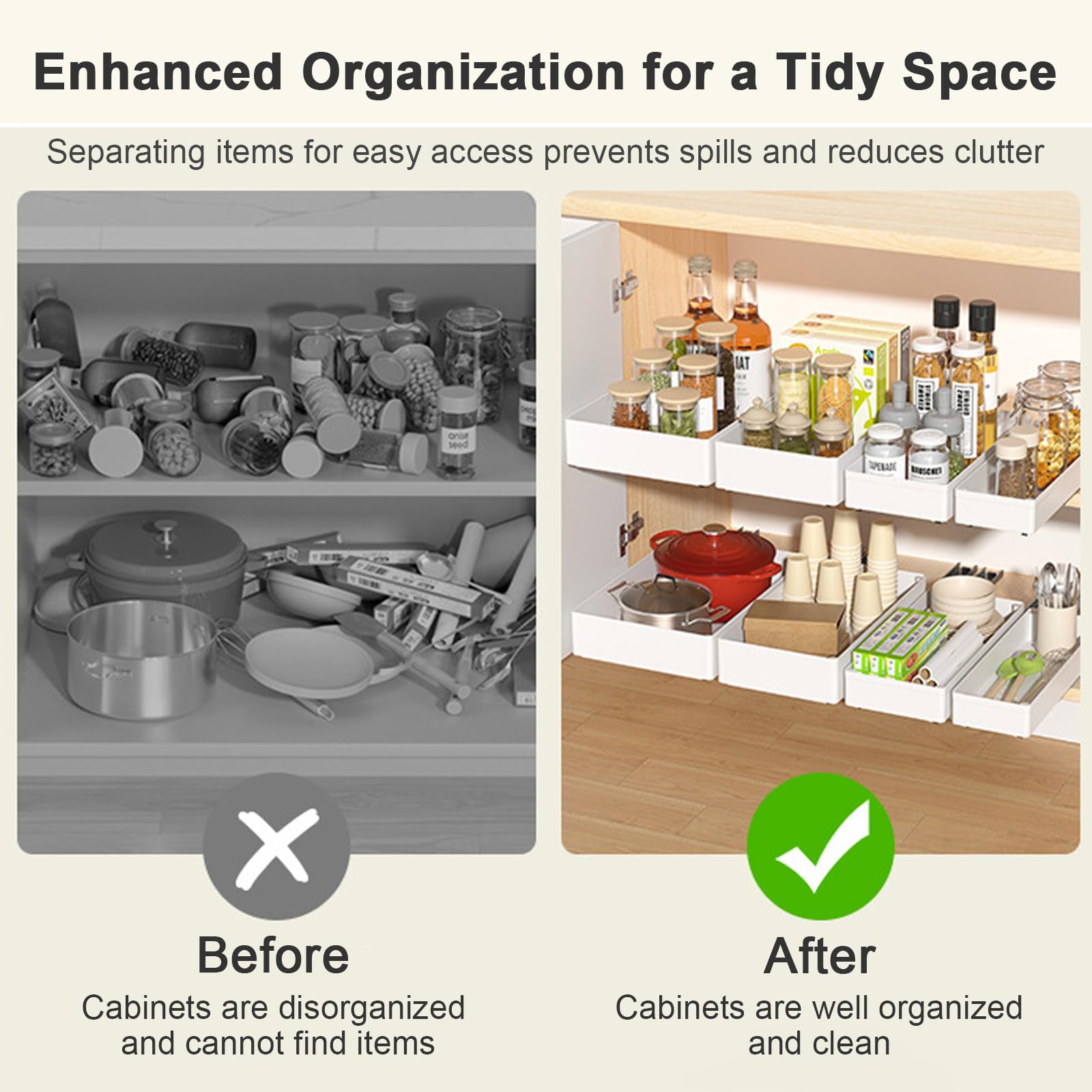 - ENHANCED ORGANIZATION FOR A CLUTTER-FREE SPACE: These pull-out drawers are perfect for keeping your kitchen essentials—like spices, cutlery, or cleaning supplies—neatly organized. By keeping items separated and easy to access, you can prevent spills and reduce clutter. The smooth sliding drawers allow you to pull out just what you need without disturbing other items, making it easier to maintain an organized and efficient space