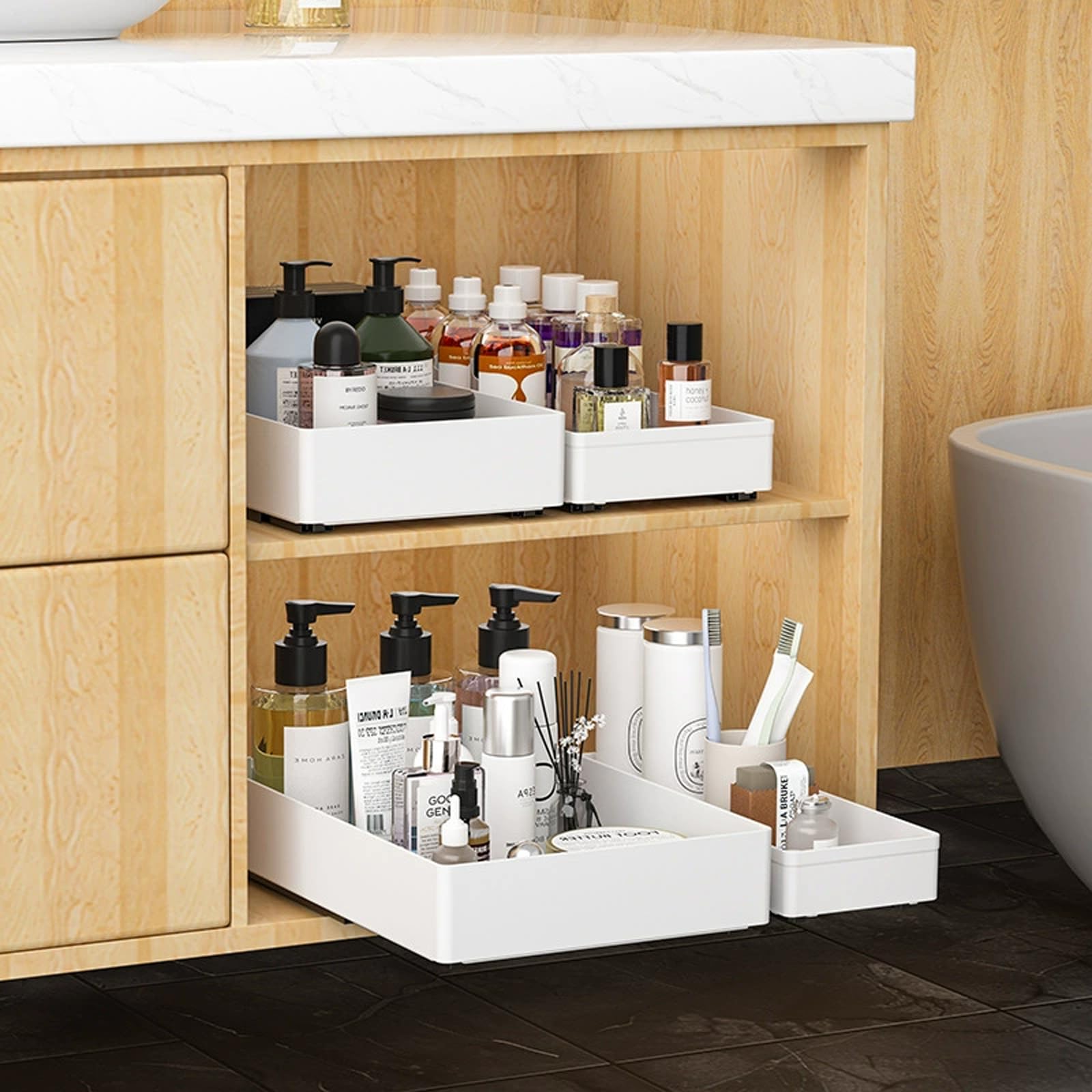 - MULTI-PURPOSE USE FOR VARIOUS STORAGE NEEDS: These versatile pull-out drawers are perfect for a wide range of uses around the home. Whether you need extra storage for cosmetics, toiletries, snacks, cleaning supplies, or kitchen utensils, these drawers help keep everything organized. Suitable for installation in cabinets, under sinks, or in pantry shelves, they provide an efficient solution to reduce clutter and maximize available storage space