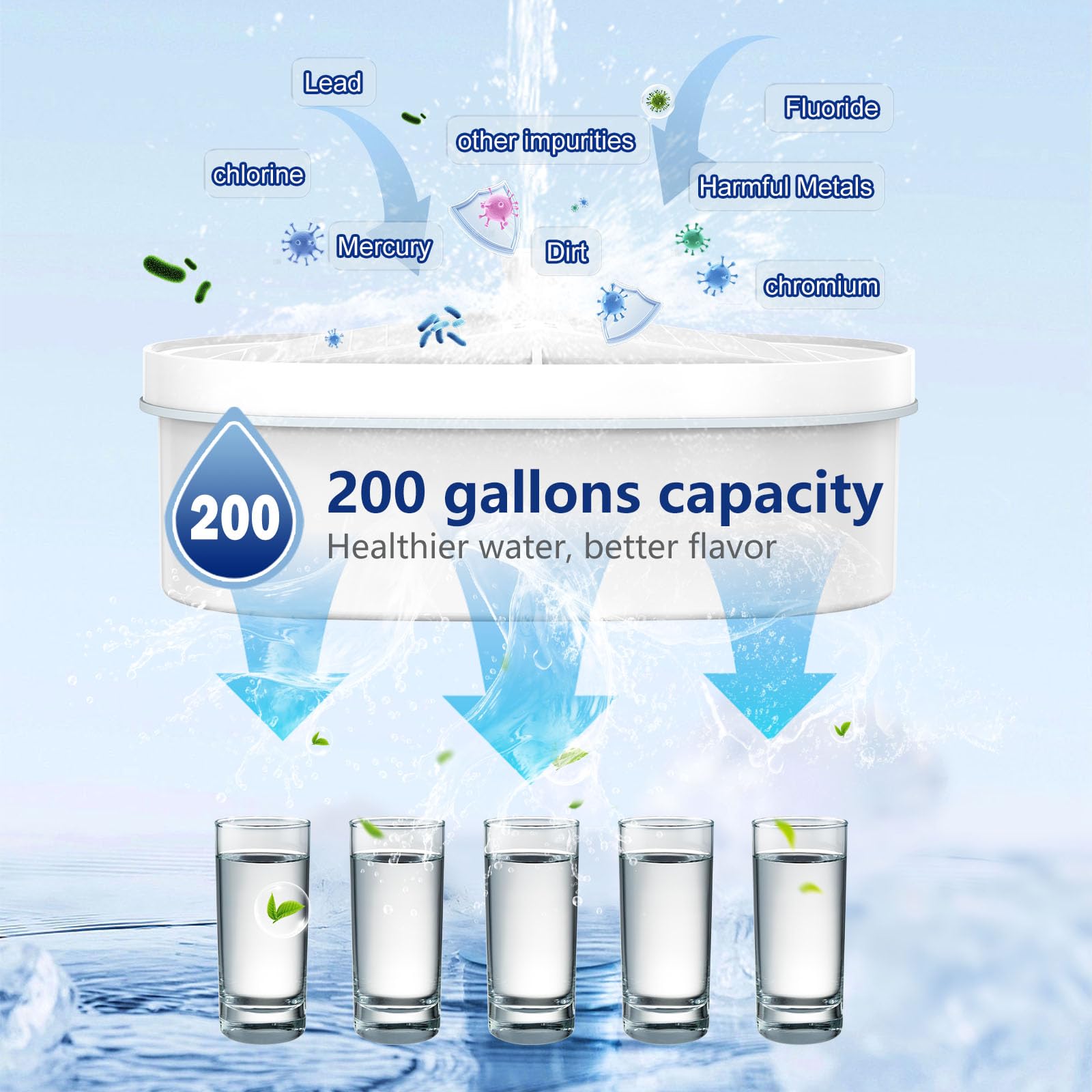 - High-Performance Water Filter: Our pitcher water filter replacement is made of BPA-free food-grade cartridge housings, and selected 100% coconut shell granular activated carbon with large surface area and micropores, which improves the taste of water and professional filtration.