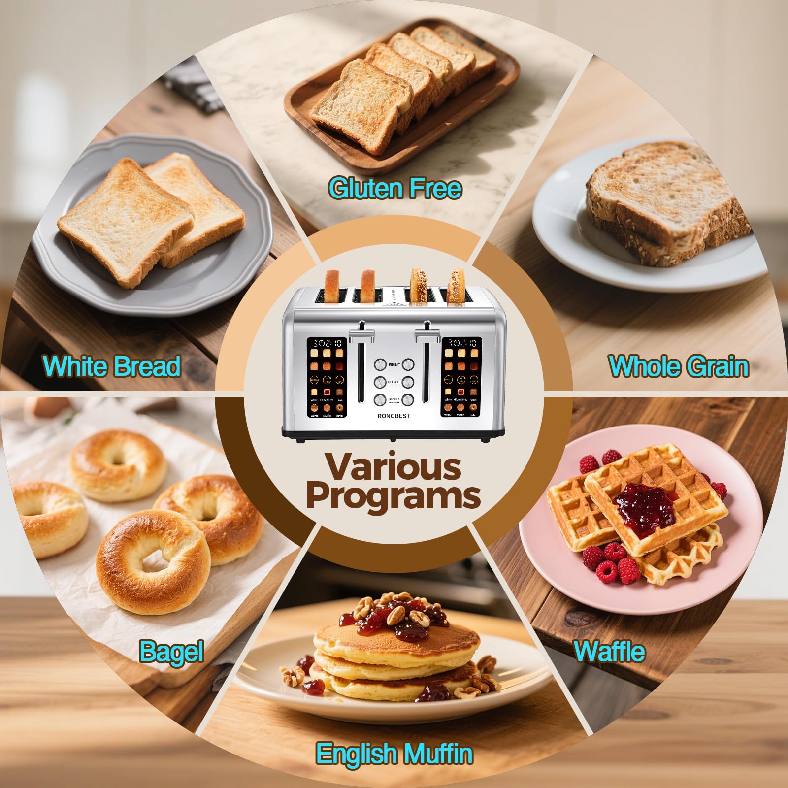 - 【Dual 4.4” Touch Screens with Independent Controls】: Toast 4 slices at once with full control over each side—6 shade levels and 6 bread types per screen (White, Gluten Free, Grain, Waffle, Muffin, Bagel).