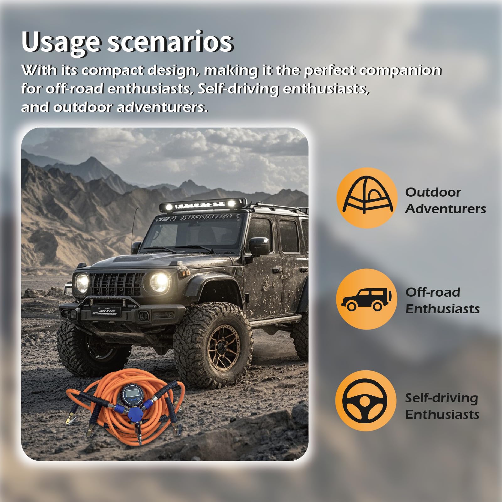 - Including: 2 sets of air hoses with quick locking air chucks, digital tire pressure gauges, tire valve stem, handbags (The precision digital tire pressure gauge is 0-200psi,it uses 2xAAA batteries,the batteries is not inclued)
