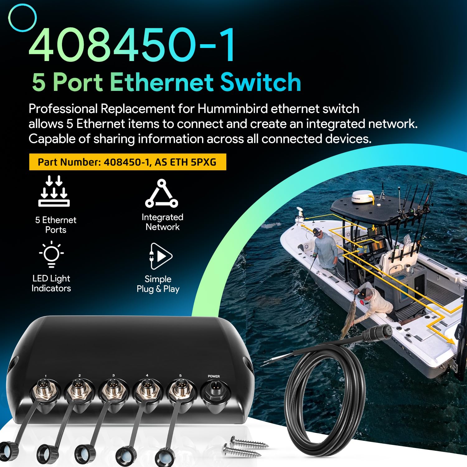 408450-1 5 Port Ethernet Switch, Replacement for Humminbird AS ETH 5PXG Network Switch Hub Waterproof for All Helix 7/8/9/10/12/15, G4N, G3N, G2N, APEX, SOLIX, Onix, ION Models, Black