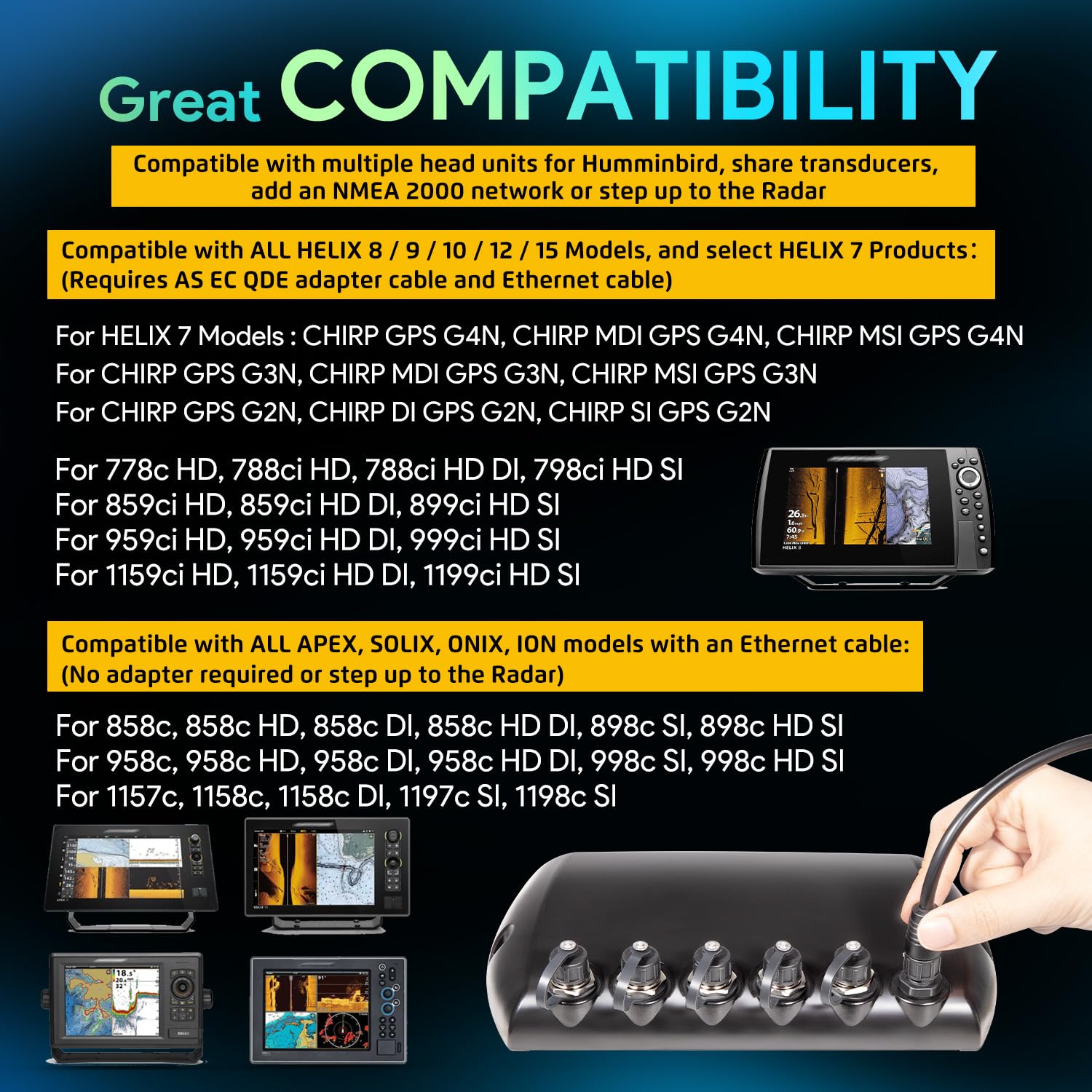 - šćUltimate Compatibilityć Compatible with All HELIX 8, HELIX 9, HELIX 10, HELIX 12 and HELIX 15 Models, select HELIX 7 Products (HELIX 7 CHIRP GPS G4N, CHIRP MDI GPS G4N, CHIRP MSI GPS G4N, CHIRP GPS G3N, CHIRP MDI GPS G3N, CHIRP MSI GPS G3N, CHIRP GPS G2N, CHIRP DI GPS G2N, CHIRP SI GPS G2N); Compatible with 778c HD, 788ci HD, 788ci HD DI, 798ci HD SI, 859ci HD, 859ci HD DI, 899ci HD SI, 959ci HD, 959ci HD DI, 999ci HD SI, 1159ci HD, 1159ci HD DI, 1199ci HD SI. Requires AS EC QDE adapter cable and Ethernet cable for installation, ensuring seamless connectivity and enhanced functionality