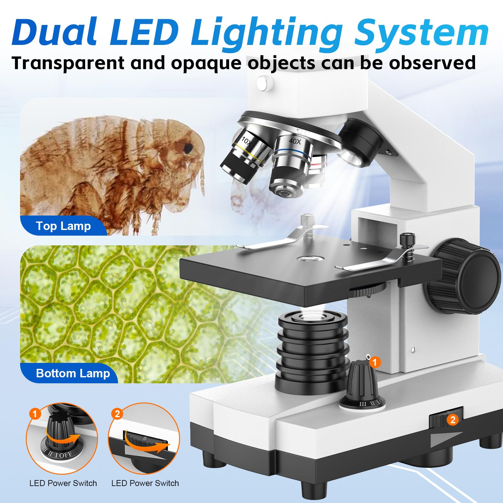 40X-2000X Monocular Microscope for Adults & Kids - Wozel Compound Microscopes for Kids with Dual LED Lights - Professional Biological Microscope with Phone Adapter Slide Set for School Home Education