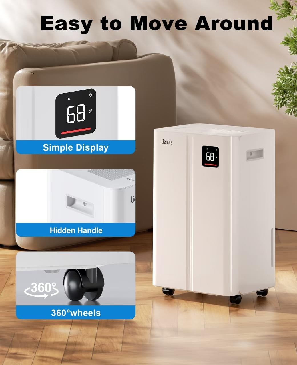 - Smart Control, Easy Operation: This large dehumidifier for basement features an intuitive electronic panel that allows you to easily set humidity levels (30%-80%), adjust fan speed, set a timer, and activate a child safety lock. Designed with users of all ages in mind, Lienuis 4500 Sq. dehumidifiers for home ensures that every family member can safely and effortlessly enjoy a comfortable and healthy home environment